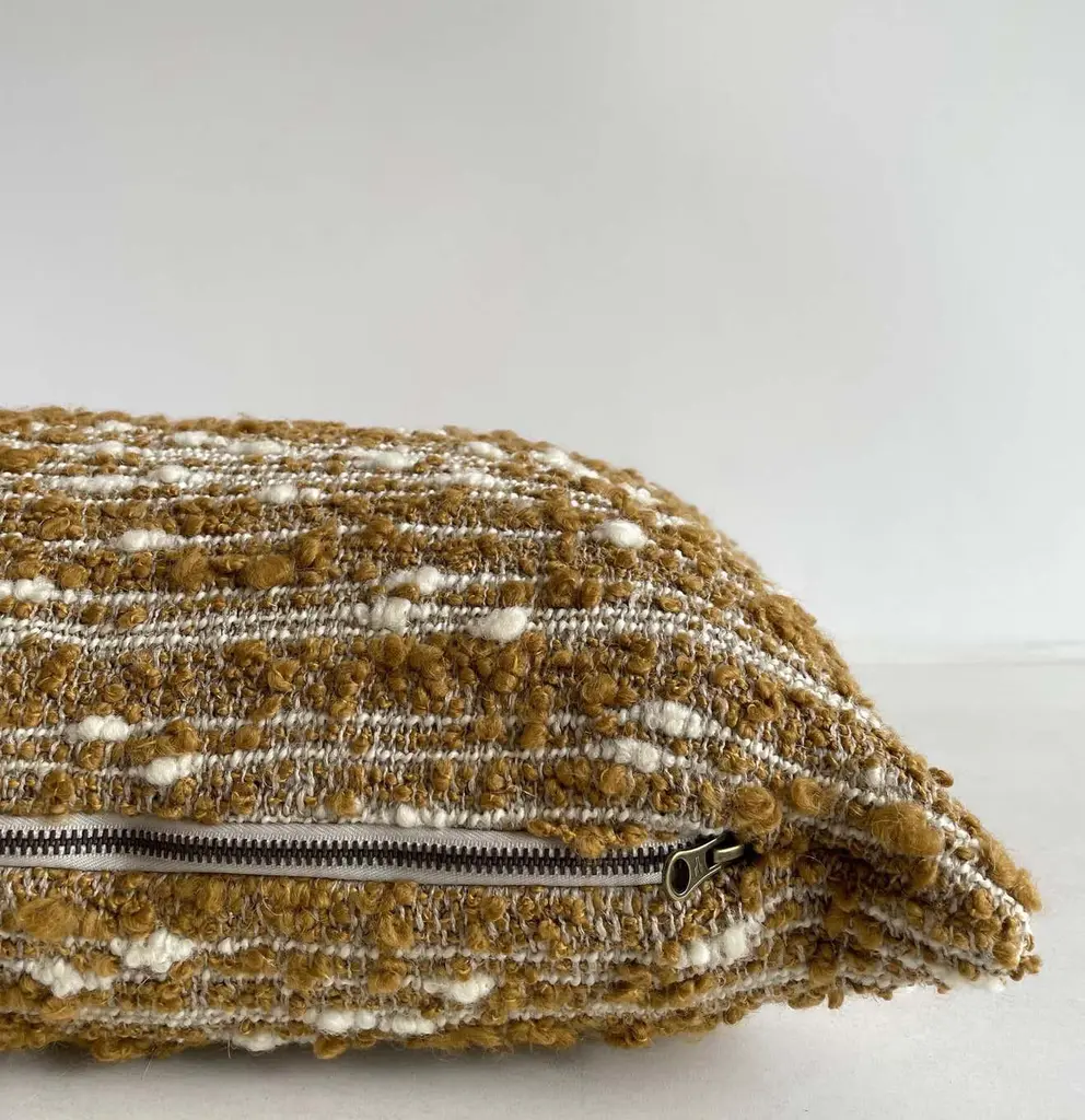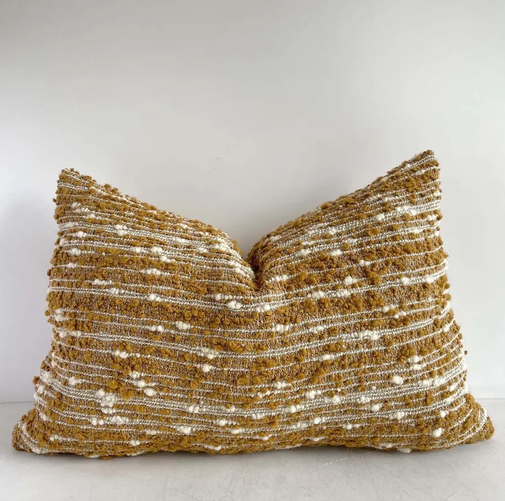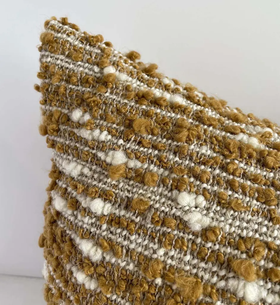 Bloom Home Inc Belgian Linen and Wool Pillow Woven in Belgium using traditional weaving techniques, Bloom Home Kim is a medium weight throw that features a soft boucle yarn on linen warp. Includes insert. If this item is backordered, please allow 2-3 weeks for production. Color: Natural and Mustard Content: Linen 33%. Wool 28%. Acrylic 28%. Polyester 8%. Polyamide 3% Size: 24” x 15”. Dimensions Height: 15 in. (38.1 cm) Width: 4 in. (10.16 cm) Depth: 24 in. (60.96 cm) Materials and Techniques Acrylic, Linen, Polyester, Wool Period 21st Century Date of Manufacture 21st Century Production Type New & Custom (Current Production) Estimated Production Time 2-3 weeks