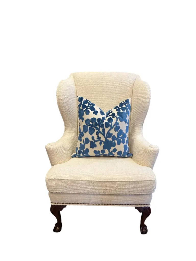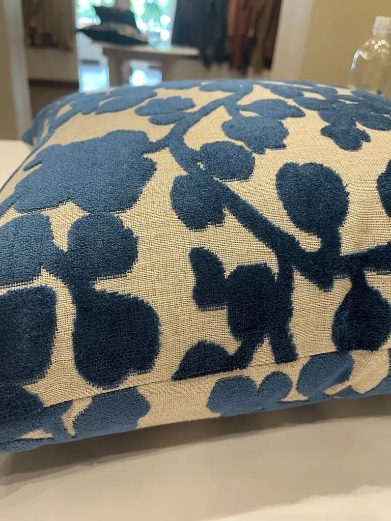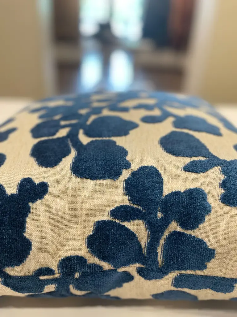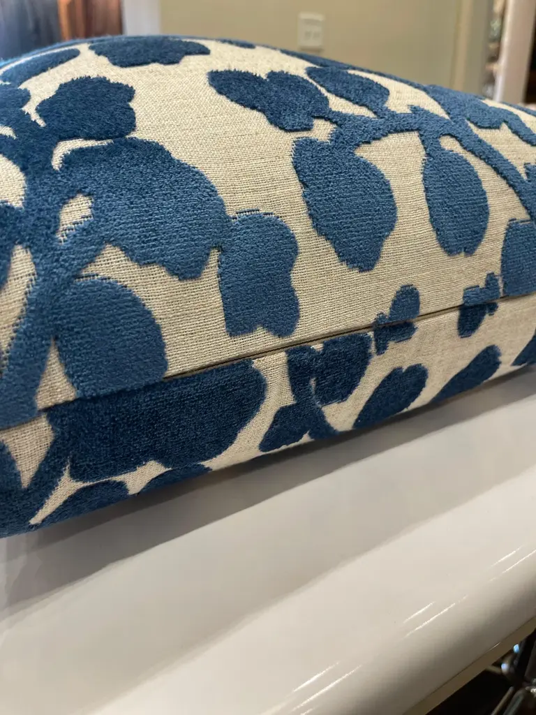 Elevate your space with our custom-made Blossom Cut Velvet Pillow Cover in rich Sapphire. Featuring a luxurious textured pattern, knife edge finish, and a discreet invisible zipper, it's paired with a plush down feather insert for ultimate comfort and elegance. Perfect for adding a touch of sophistication to any room.