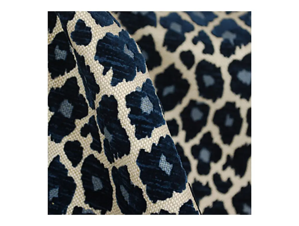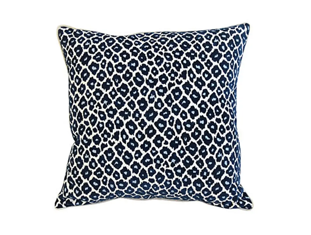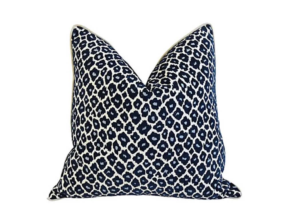 Large custom-tailored pillow in a woven cotton-blend fabric depicting blue-colored leopard spots in a soft chenille velvet pattern. Cream-colored cotton-velvet back. Zipper closure. Custom cord trim. Ultra plump goose feather-and-down insert. Excellent new/unused condition.
