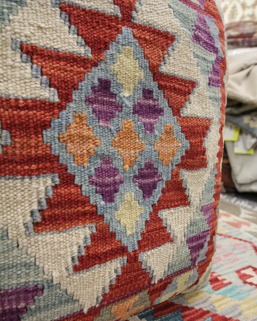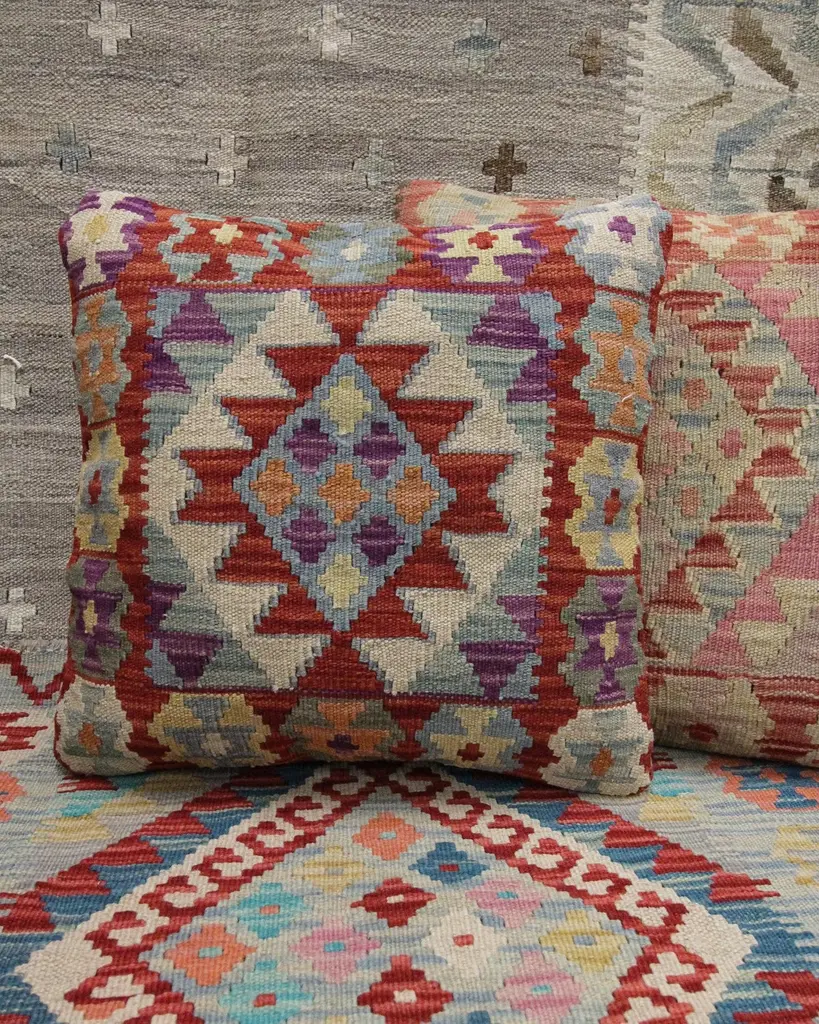 This new traditional kilim cushion cover is a handwoven piece constructed in the early 21st century. The design has been delicately woven by hand and features a symmetrical geometric pattern that is sure to stand out on any sofa or armchair! This piece has been made with a rich colour palette of red, blue and purple with accents of yellow and rust. Both the colour and design make it the perfect accent accessory for any room in your home. It is made by master weavers who use only the finest. Locally-sourced materials. Including hand-spun wool and cotton that have been dyed using organic, non-toxic dyeing techniques that have been used for generations. Add a touch of colour and texture to your home interior with this fine wool cushion cover. We have various colours and styles available to mix and match to suit your taste and interior! Excellent condition, ready for use! CU301Blush Red Wool Kilim Cushion Cover Handwoven Geometric Scatter Cushion- 50x50cm.