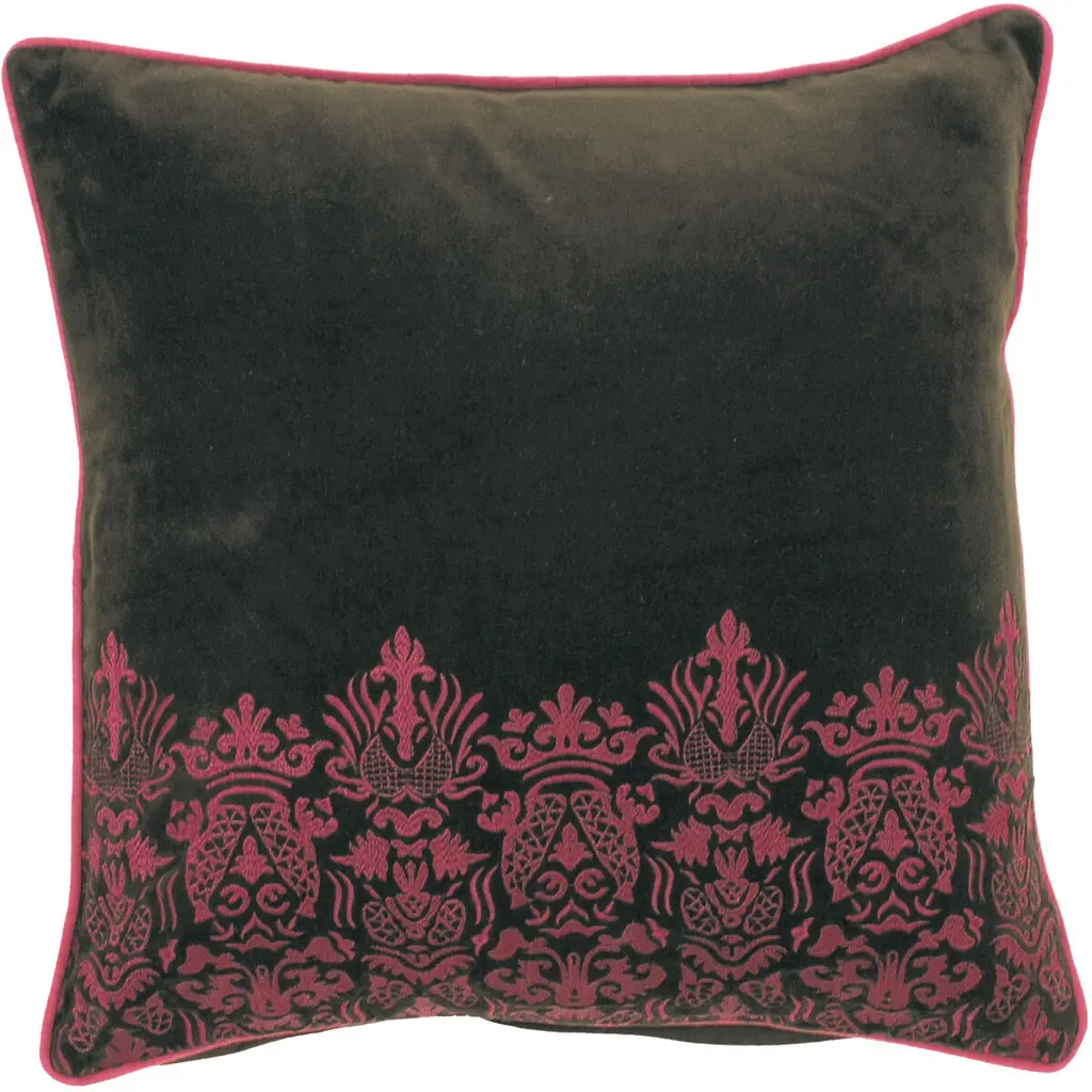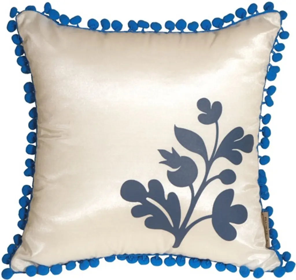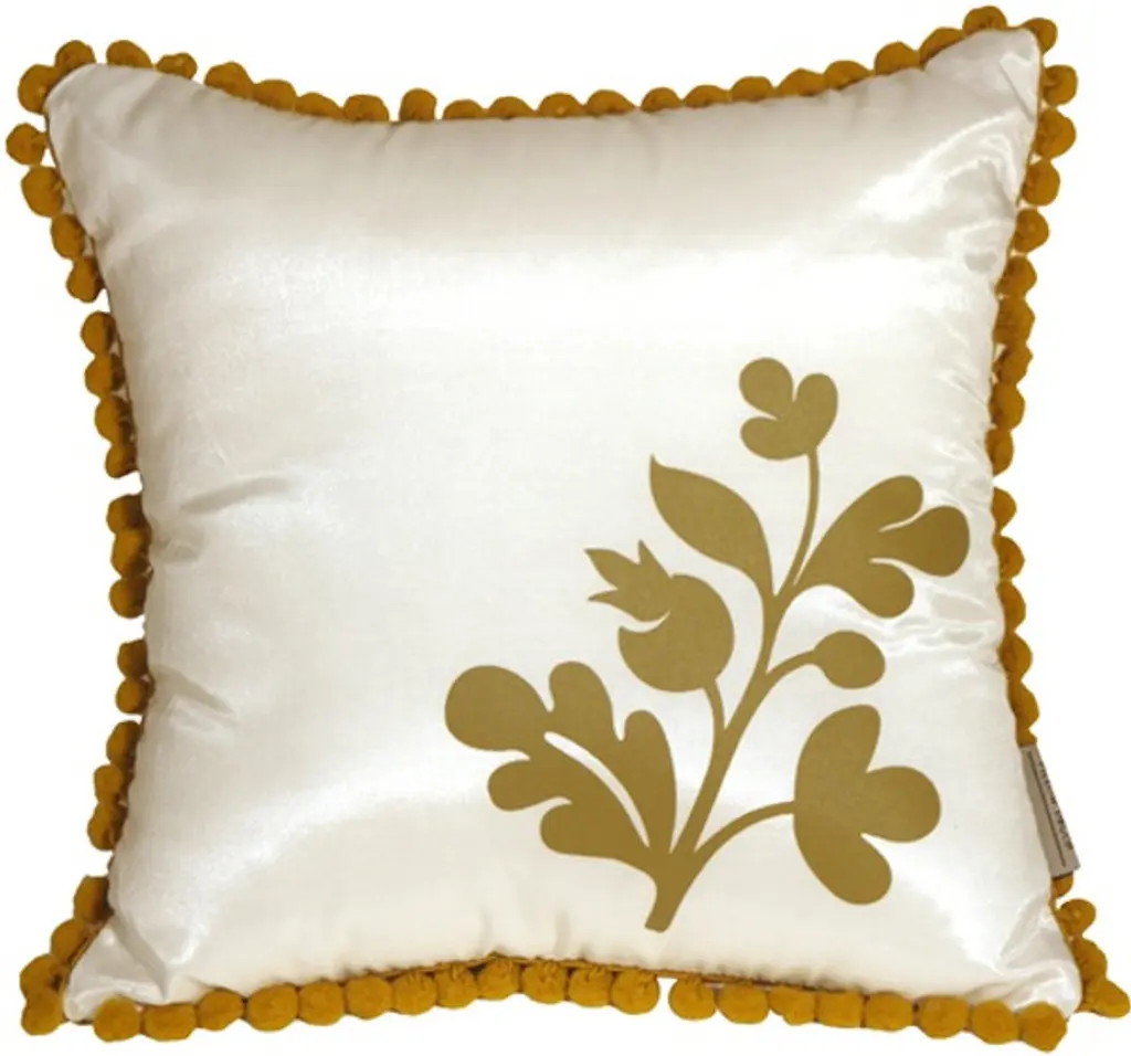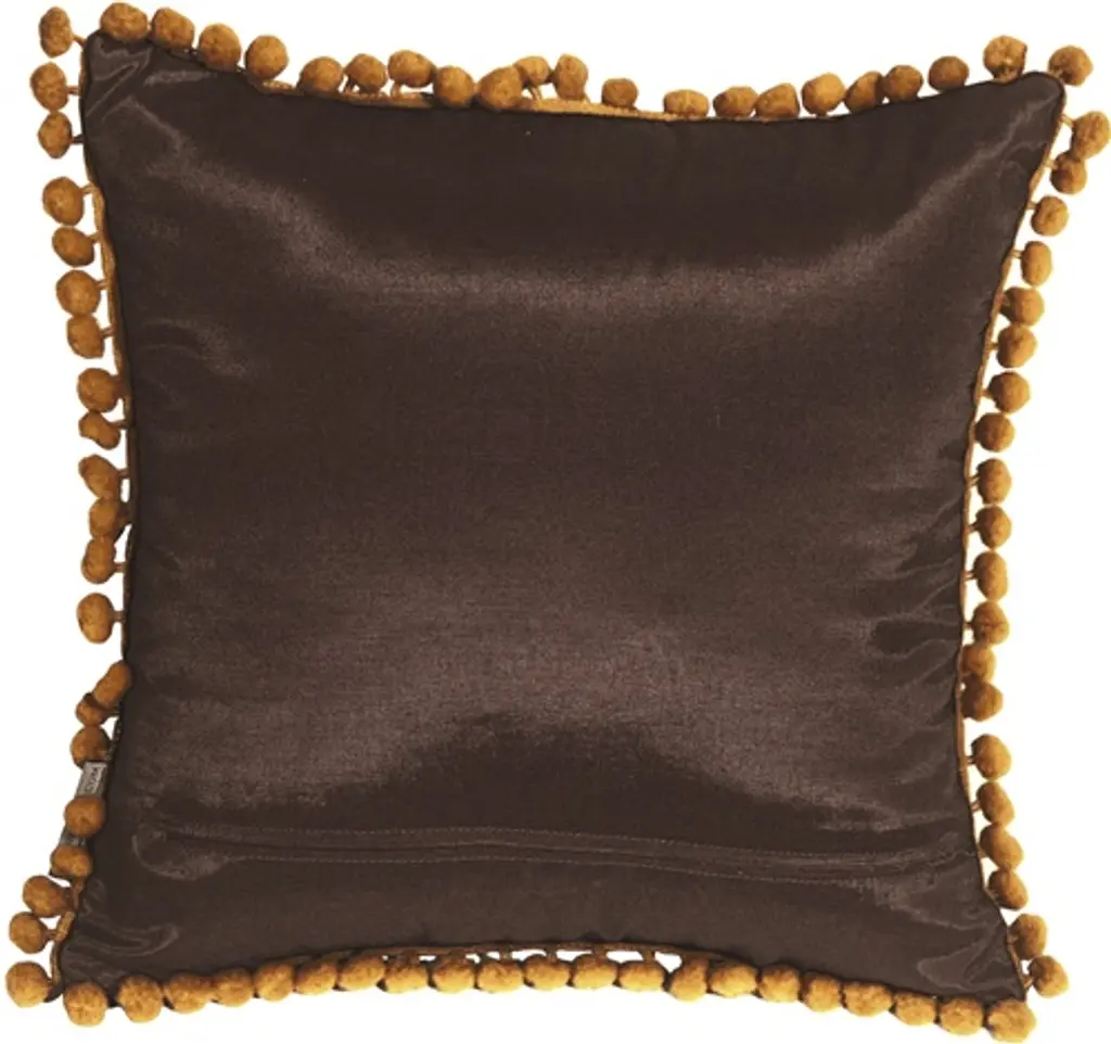 A little sister to our beautiful Bohemian Damask Throw Pillows. This delightful throw pillow has a fringe of lively, ocher pom poms around the edge and a bold floral ocher print in the corner. The background color and the back of the pillow is a solid shimmering chocolate brown. Match it up with our large Bohemian Damask throw pillow and you have a wonderful contemporary pillow design story in your home. Size: 12"x12" Square Fabric: 85% Polyester, 15% Viscose fabric content Silk screen design on pillow front only. Back panel in solid chocolate brown color. Pom pom fringe Zipper closure on back panel Hand wash inside out in cold water, mild detergent, air dry