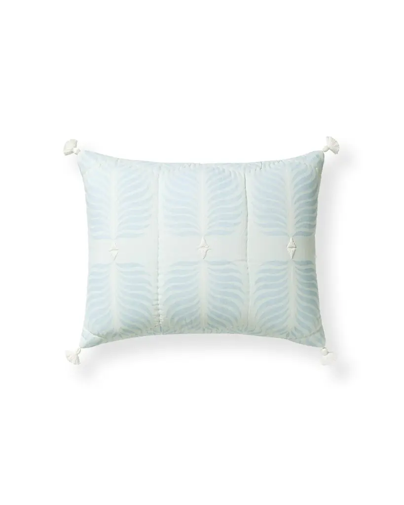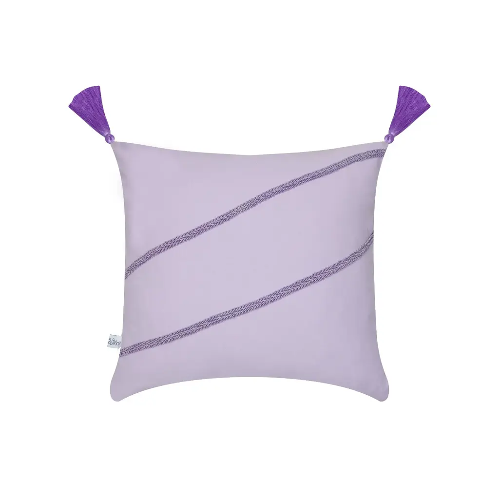 A little sister to our beautiful Bohemian Damask Throw Pillows. This delightful throw pillow has a fringe of lively, blue pom poms around the edge and a bold floral blue print in the corner. The background color of the pillow is a solid shimmering white and the back of the pillow is a solid shimmering blue. Match it up with our large Bohemian Damask throw pillow and you have a wonderful contemporary pillow design story in your home. Size: 12"x12" Square Fabric: 85% Polyester, 15% Viscose fabric content Silk screen design on pillow front only. Back panel in matching solid blue color. Pom pom fringe Zipper closure on back panel Hand wash inside out in cold water, mild detergent, air dry
