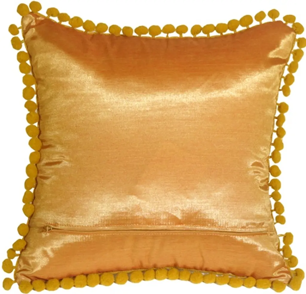 A little sister to our beautiful Bohemian Damask Throw Pillows. This delightful throw pillow has a fringe of lively, ocher pom poms around the edge and a bold floral ocher print in the corner. The front background color of the pillow is a solid shimmering white and the back of the pillow is a solid shimmering ocher. Match it up with our large Bohemian Damask throw pillow and you have a wonderful contemporary pillow design story in your home. Size: 12"x12" Square Fabric: 85% Polyester, 15% Viscose fabric content Silk screen design on pillow front only. Back panel in solid ocher color. Pom pom fringe Zipper closure on back panel Hand wash inside out in cold water, mild detergent, air dry