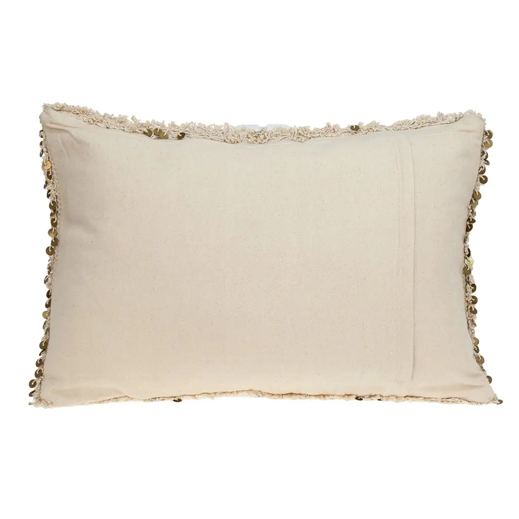 Elevate your space with modern bohemian charm using this handwoven shaggy pillow. Designed with rich textures and delicate dangling charms, it adds depth and character to any room. The warm creamy tones and soft shaggy feel create a cozy, inviting ambiance. You'll love the gentle movement and subtle sounds of the dangling accents. Perfect for a sofa, bed, or chair, this unique piece enhances any décor with effortless style. Product Features: Beige and copper rectangular throw pillow Comes with shaggy accents Design is on one side only Removable cover with zipper closure for easy cleaning Pillow cover with poly insert For indoor use only Care instructions: dry cleaning only Dimensions: 16"H x 24"W x 5"D Material(s): Shell: cotton Filling: polyester