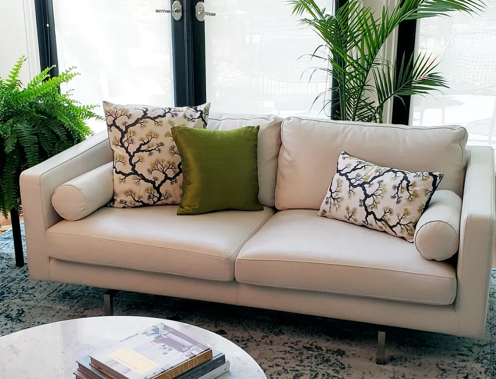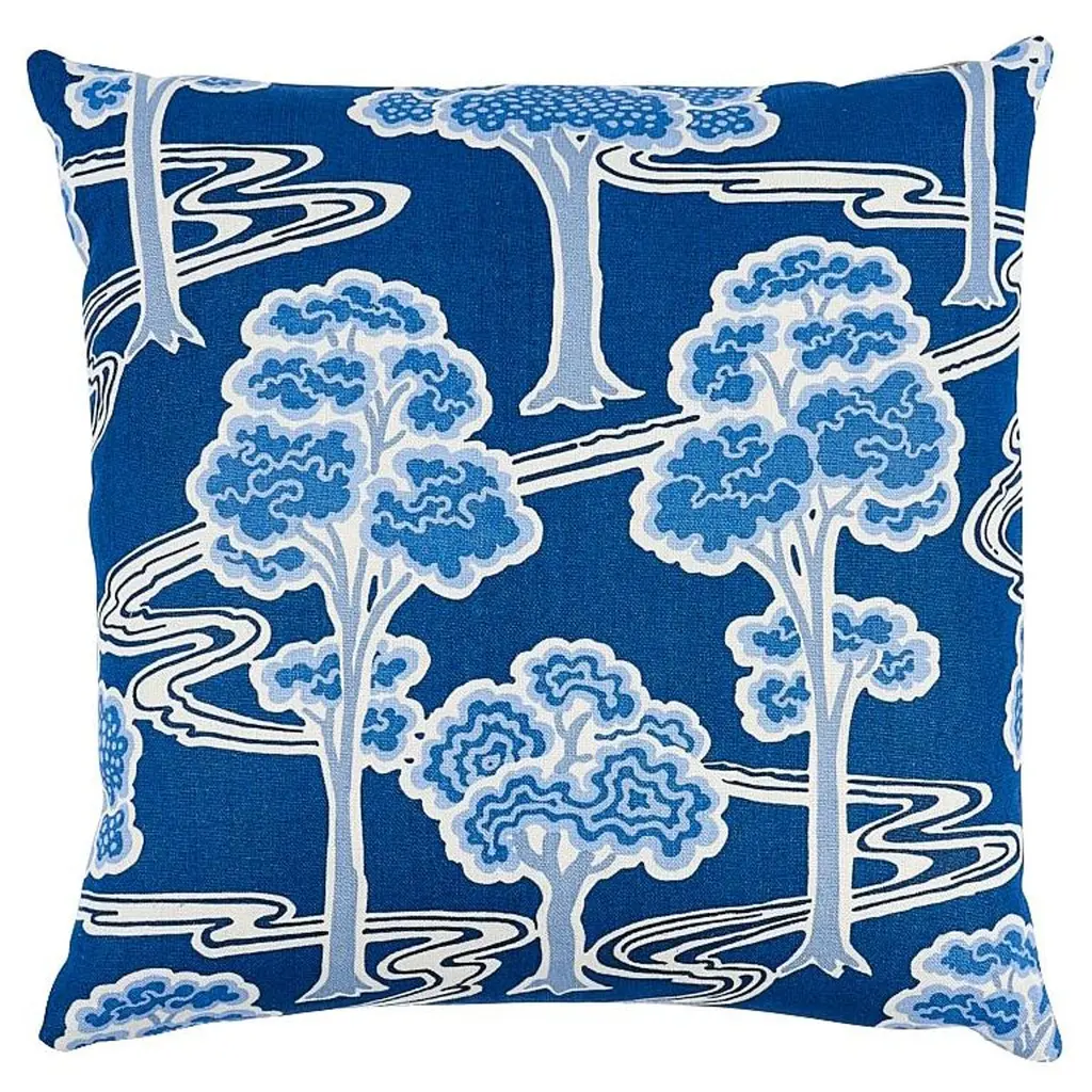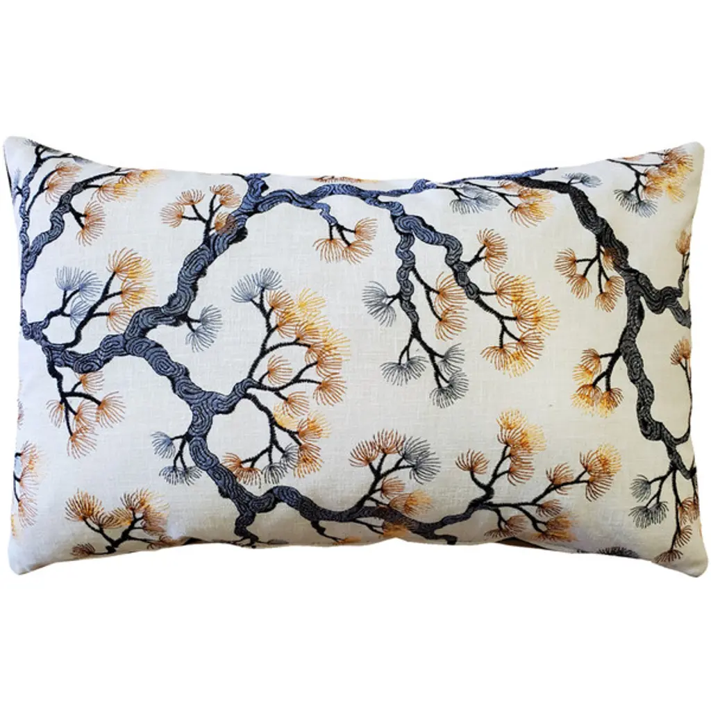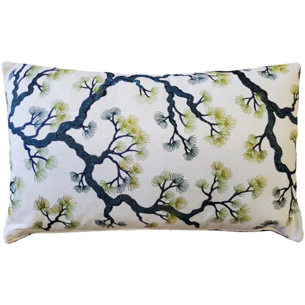 The Bonsai Pine Teal Green Throw Pillow is a gorgeous embroidered decorative pillow. Beautifully detailed pine branches in navy blue and teal spread out across a cream background fabric, where they are punctuated with lime green, olive green and teal green pine needles. The back of the pillow is a matching navy-slate blue velvet. The affect is simply stunning. Place this pillow anywhere it can be frequently admired! Size: 19"x19" Square Fabric: 52% Polyester, 48% Cotton with 100% Viscose embroidery thread. Design on front only. Matching blue velvet fabric on back. Knife edge seams. Inside seams are serged for strength and durability. Hidden zipper closure in bottom seam of pillow cover Dry Clean Only Made in Canada: Designed and made in Pillow Decor's Vancouver workroom.