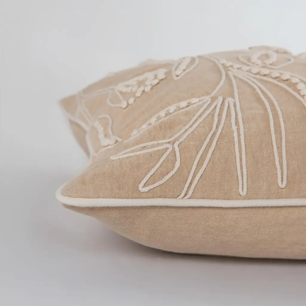 Cord embroidery lays the foundation for this botanical masterpiece. Hand tied French Knots lend the crafted artistry of this pillow. This pillow is at home in any decor celebrating crafted pieces, organic forms, and a whimsical embrace of natural elements. Knife edged, this pillow features a solid cotton duck back (same as the pillow face background) and sports a hidden zipper for ease of fill and cleaning.