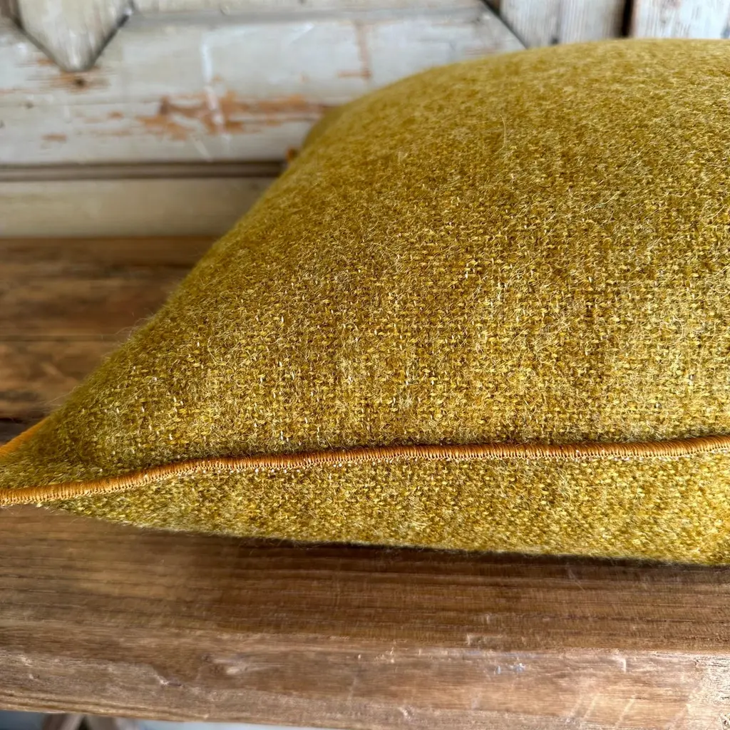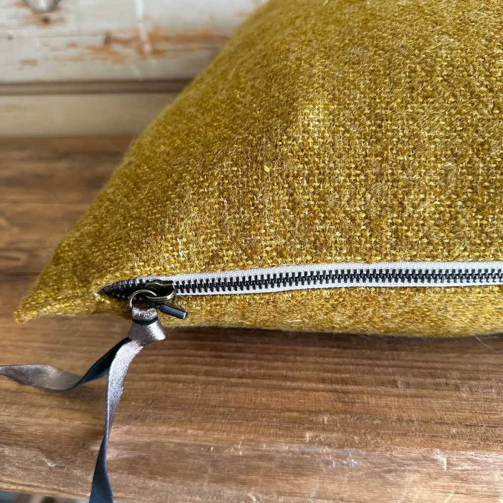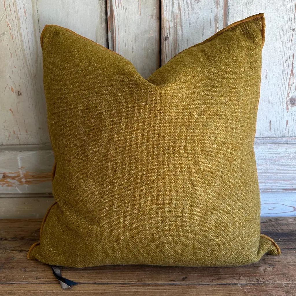 Custom wool blend accent pillow with down insert Color: Ocre which is a dijon french mustard colored nubby boucle style pillow with a stitched edge, metal zipper closure. Size: 26” x 26”Our pillows are constructed with vintage one of a kind textiles from around the globe. Carefully constructed with the finest textiles, with hidden zipper closure, and overlocked seams. Includes a down feather insert. Limited quantities available. If this item is backordered, please allow 6-8 weeks for production.