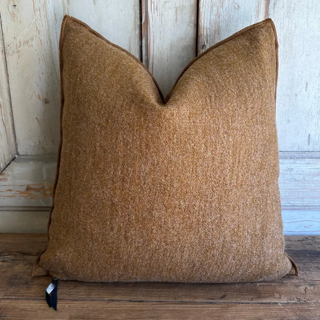 Custom wool blend accent pillow with down insert. Color:Havane which is a deep rust with warm brown tones, nubby boucle style pillow with a stitched edge, metal zipper closure. Size: 22”x22”.Our pillows are constructed with vintage one of a kind textiles from around the globe. Carefully constructed with the finest textiles, with hidden zipper closure, and overlocked seams. Includes a down feather insert. Limited quantities available. If this item is backordered, please allow 6-8 weeks for production.