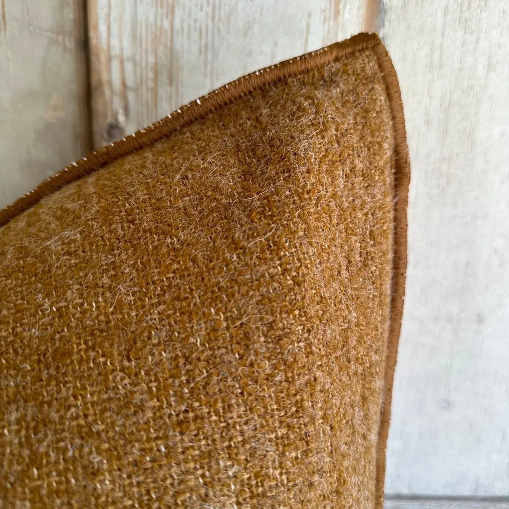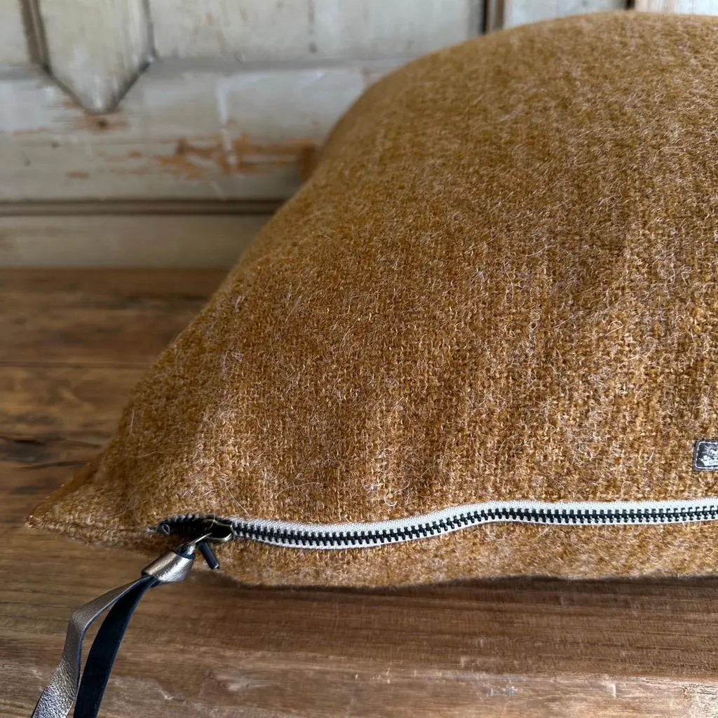 Custom wool blend accent pillow with down insert. Color:Havane which is a deep rust with warm brown tones, nubby boucle style pillow with a stitched edge, metal zipper closure. Size: 26”x26”.Our pillows are constructed with vintage one of a kind textiles from around the globe. Carefully constructed with the finest textiles, with hidden zipper closure, and overlocked seams. Includes a down feather insert. Limited quantities available. If this item is backordered, please allow 6-8 weeks for production.