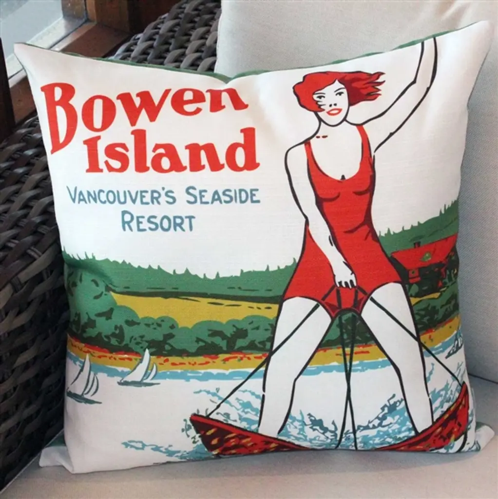 Developed as a tourist destination in the early 1900's by the Union Steamship Company, Bowen Island quickly became one of Vancouver's premier getaways. Today, this picturesque 52sq km/20sq mi island is home to approximately 3,200 residents, and continues to welcome fun seeking vacationers. The design on this colorful indoor/outdoor throw pillow is taken from a 1930s Union Steamship travel brochure. The pillow is made from a soft, but durable indoor/outdoor fabric. The back of the pillow is a coordinating green striped pattern. From the Museum of Vancouver's Retail Collection. Designed and manufactured by Pillow Decor under license from the Museum of Vancouver. Size: 20"x20" Square Fabric: 100% polyester indoor/outdoor Design on front only. Back in green stripe pattern Knife Edge Seams Hidden Color Matched Zipper Closure Hand wash cold, air dry Made in Canada: Designed and made in Pillow Decor's Vancouver workroom.
