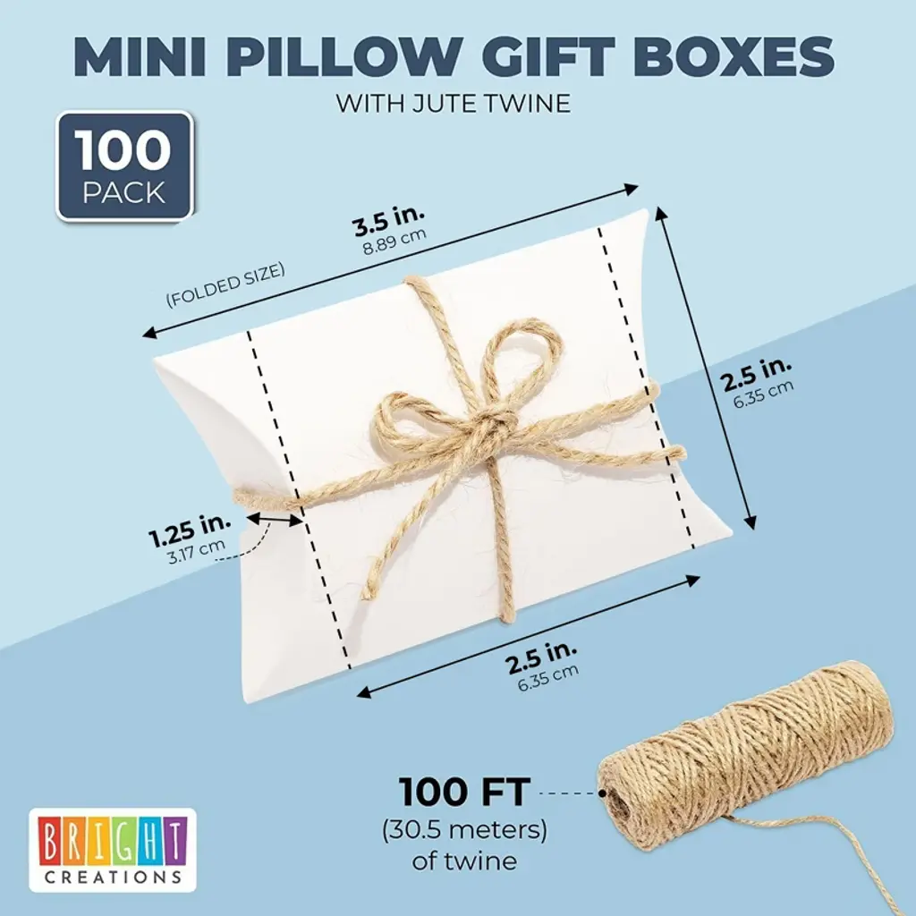 Bright Creations 100 Pack Mini Pillow Gift Box Set With Jute Twine For Wedding Party Favor, 3.5 X 2.5 X 1.25 Inches, White Paper