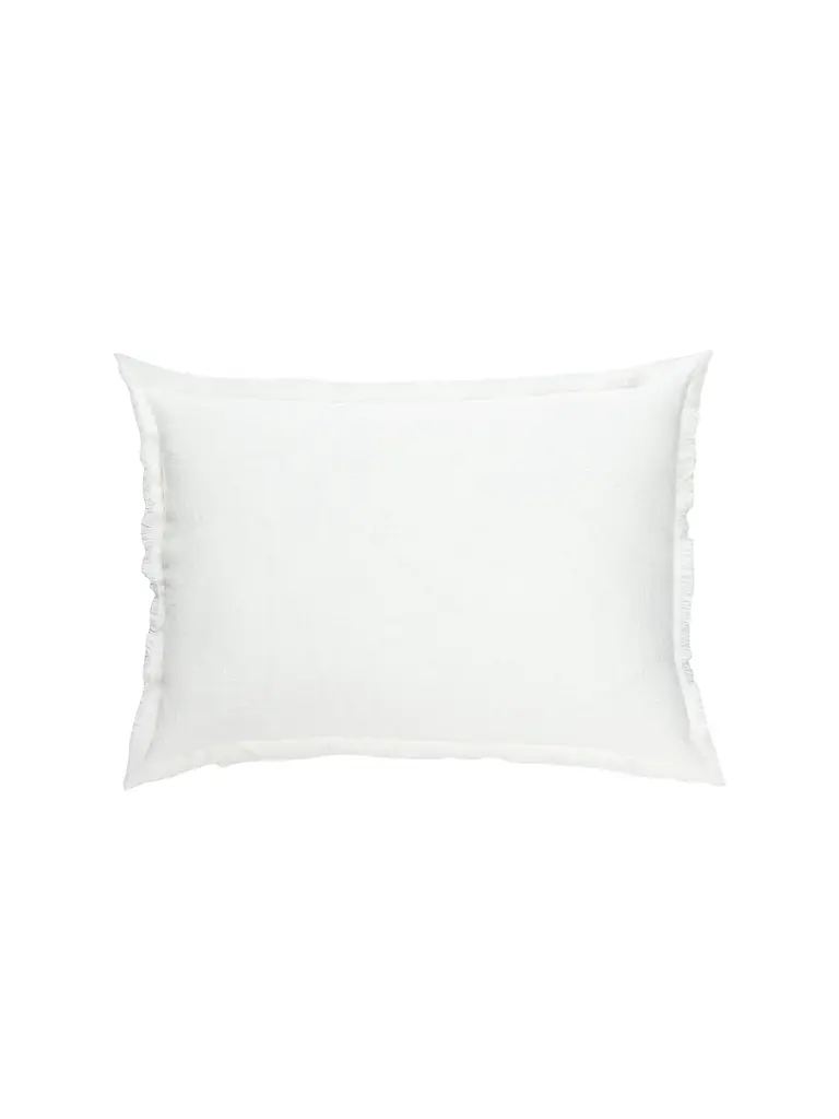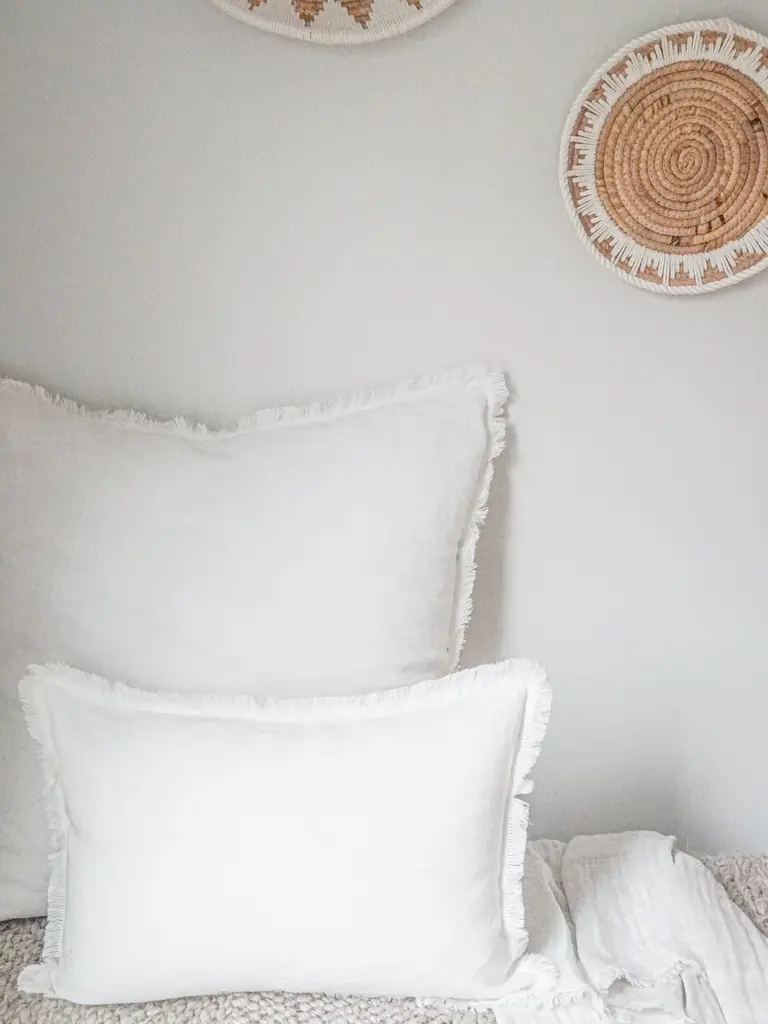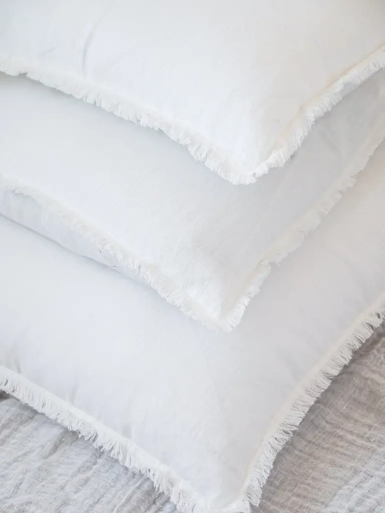 Our Bright White Fringe So Soft Linen Pillow is Soo soft- you won’t believe it's linen! This yarn has a slight nub which gives it a beautiful natural texture. Edges have a self-fringe on all sides. Details Front & Back Color: Bright WhiteMaterial: 100% Linen (washed)Concealed zipper closure on back side.Hand washing or a delicate cycle with like colored fabrics recommended. Hang to Dry. Options Pillows are available in 3 options:Pillow Cover Only, with a Down Alternative insert, or with a Down InsertDown Alternative InsertBenefits: Allergen free, Better back support, Retain their shapeInside Fill: 1.2 denier x1.25" polyester gelOuter Shell: 65% polyester/ 35% white cotton blendMade in the USA Down InsertBenefits: Durable, Easy to fluff and re-style, Retains heatInside Fill: 95% gray duck feathers and 5% goose downOuter Shell: 233-thread count 100% cotton fabric Made in the USA