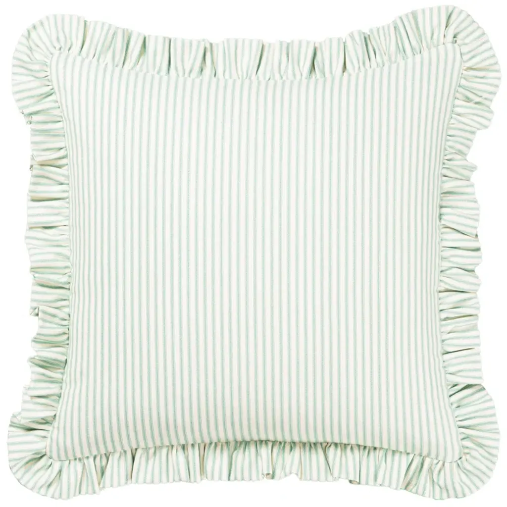 This pillow features Brigitte Stripe with a 1.5" ruffle finish. The perfect thin stripe, not too casual and not too dressy. Pillow includes a feather/down fill insert and hidden zipper closure.