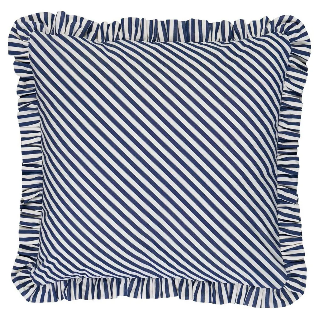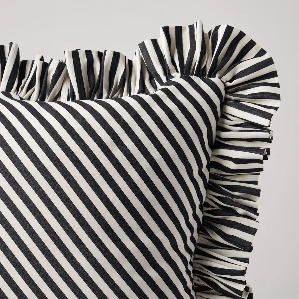 This pillow features Brigitte Stripe with a 1.5" ruffle finish. The perfect thin stripe, not too casual and not too dressy. Pillow includes a feather/down fill insert and hidden zipper closure.