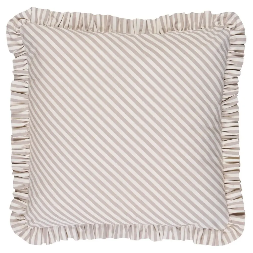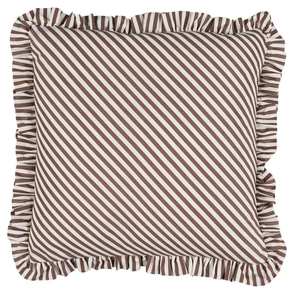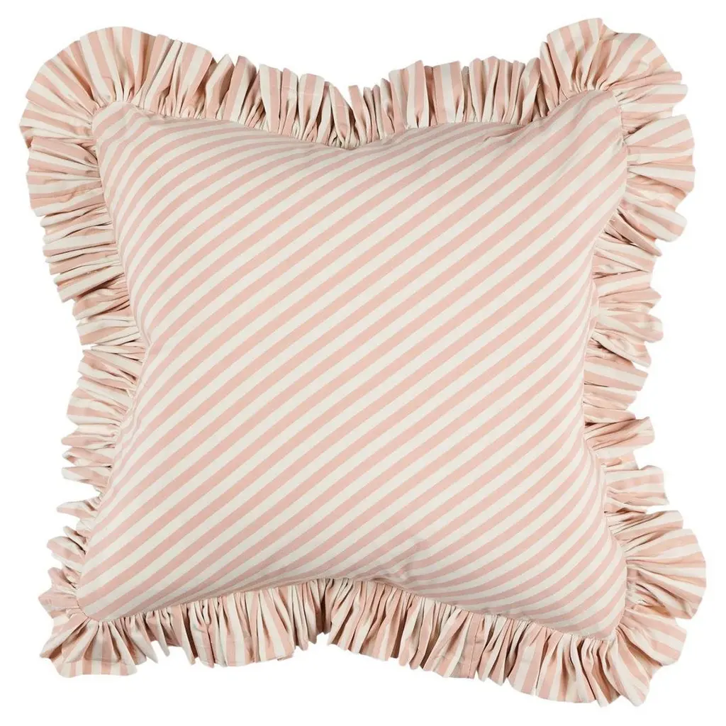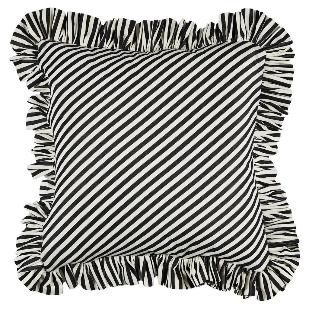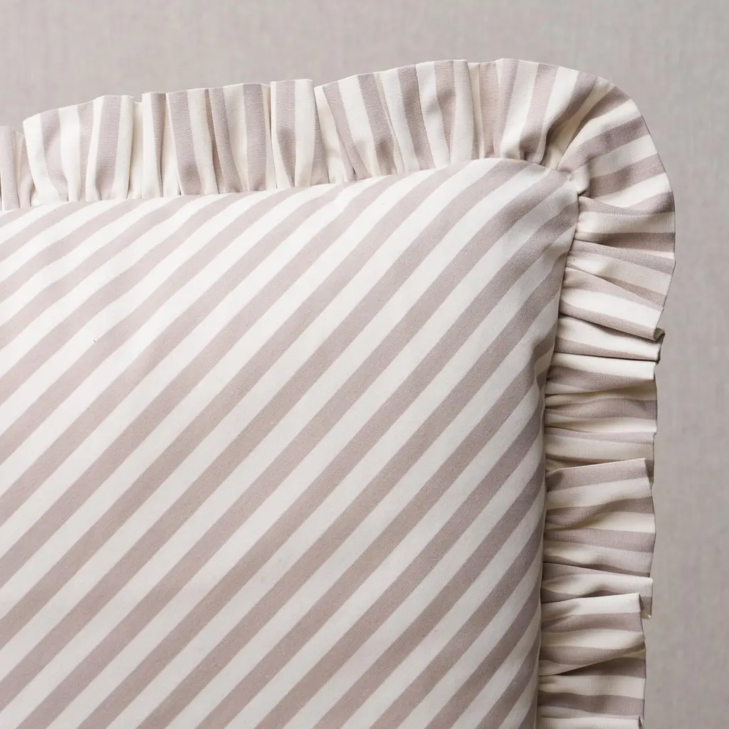 This pillow features Brigitte Stripe with a 1.5" ruffle finish. The perfect thin stripe, not too casual and not too dressy. Pillow includes a feather/down fill insert and hidden zipper closure.