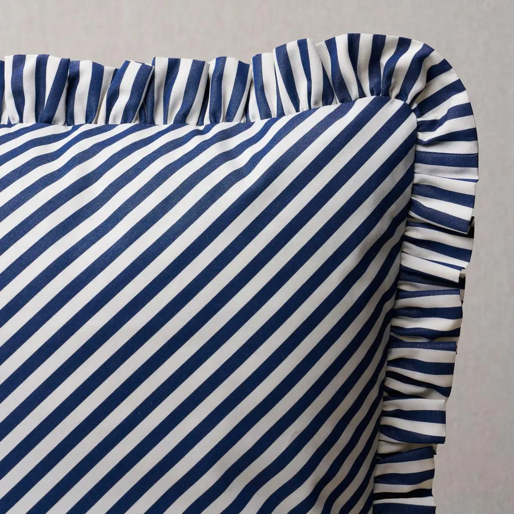 This pillow features Brigitte Stripe with a 1.5" ruffle finish. The perfect thin stripe, not too casual and not too dressy. Pillow includes a feather/down fill insert and hidden zipper closure.