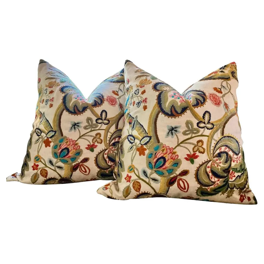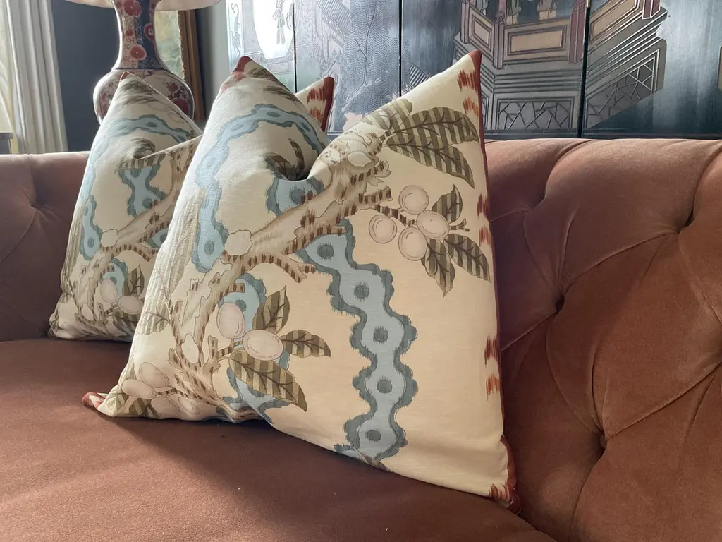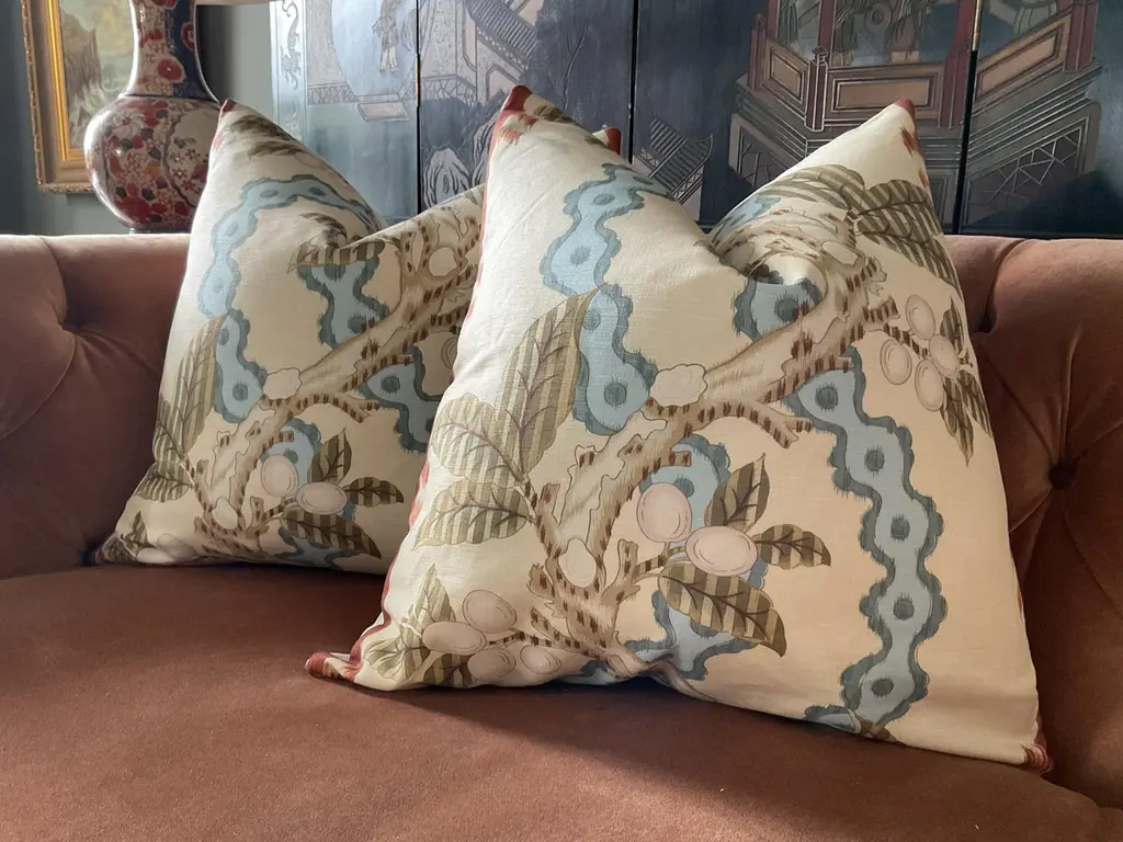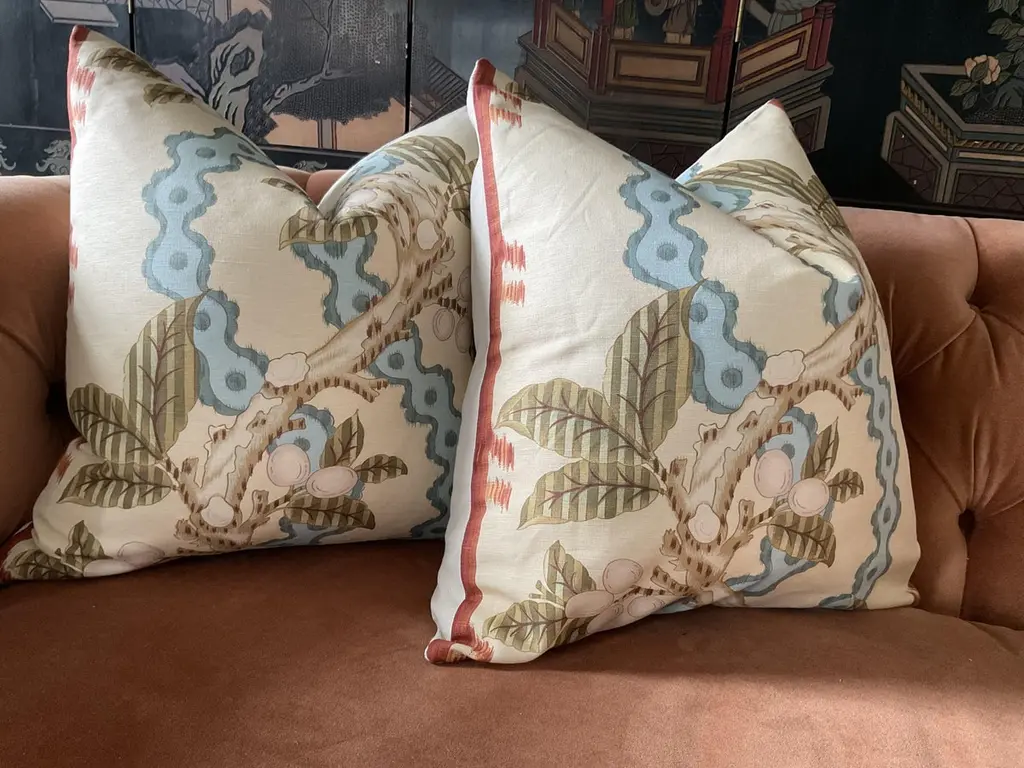 From Brunschwig and Fils comes this contemporary design, featuring floral stripes throughout. "Josselin" in Rust and Blue comes in several colorways, message me for details!Covers feature beautiful shades of soft blue, copper, and greens.The backing will be coordinating eru linen and the closure will be by an invisible zipper.Pattern placement does vary.These will comes as a 22" pair with plush down inserts. Closure is by way of an invisible zipper.