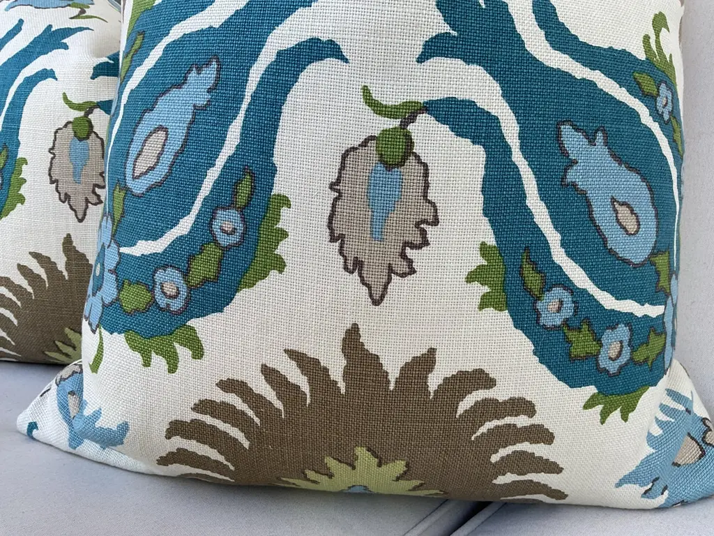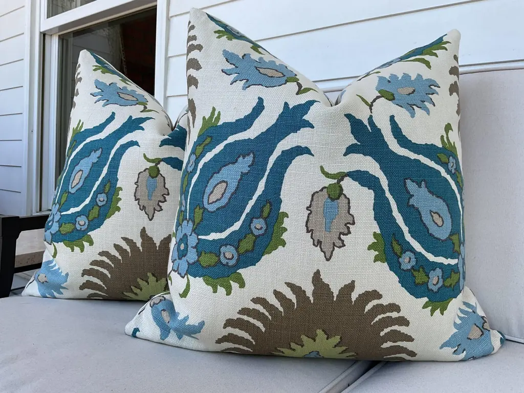 Beautiful fun print in green linen from notorious design house Brunschwig and Fils comes " Kashmiri". STUNNING! The backing is soft coordinating linen.With touches of dark blue, teale and the smallest touch of taupe, this print is sure to brighten up your space! Kashmiri will be featured on the fronts unless the both-sided option is selected. About UsAt Accent Marks, each designer pillow is crafted with care using the finest hand-selected fabrics and trims, paired with durable, discreet invisible zippers. We specialize in creating beautiful, high-quality pieces that elevate your home decor. While most of our listings feature 22" pillow pairs, we also offer a range of sizes and single pillow options to suit your needs. All of our Accent Marks pillows are proudly made in the United States.If you don't see the fabric you're searching for, please reach out via message as we have other fabrics available upon request and can create anything that you like. Thank you for visiting Accent Marks!