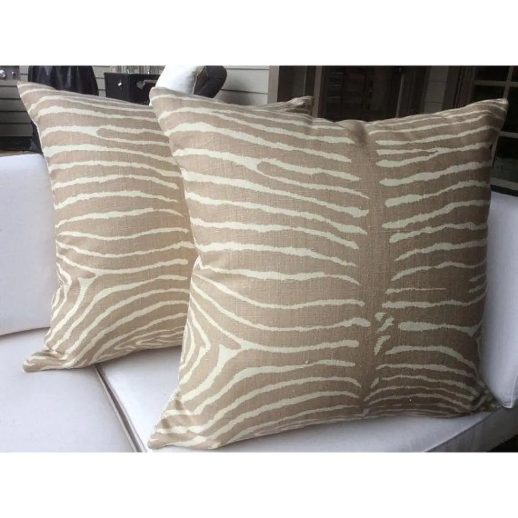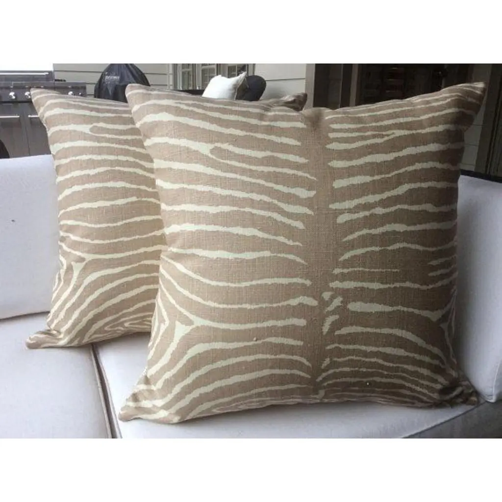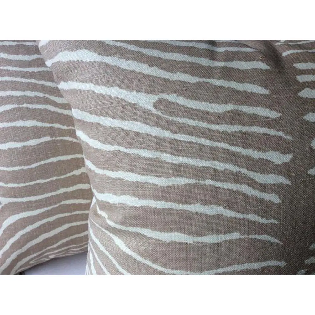 From Brunschwig & Fils comes this exotic zebra print in soft taupey tan and off white heavy linen fabric. My workroom has taken this and fashioned it into pillows, featuring coordinating linen backs and an invisible zippers.The official colorway from B & F is titled "Pewter", but I would describe it as soft tan and soft cream to ivory. Stunning!This 22" pair of pillows comes complete with down feather inserts - they are new, and ready for display immediately!About UsAt Accent Marks, each designer pillow is crafted with care using the finest hand-selected fabrics and trims, paired with durable, discreet invisible zippers. We specialize in creating beautiful, high-quality pieces that elevate your home decor. While most of our listings feature 22" pillow pairs, we also offer a range of sizes and single pillow options to suit your needs. All of our Accent Marks pillows are proudly made in the United States.If you don't see the fabric you're searching for, please reach out via message as we have other fabrics available upon request and can create anything that you like. Thank you for visiting Accent Marks!