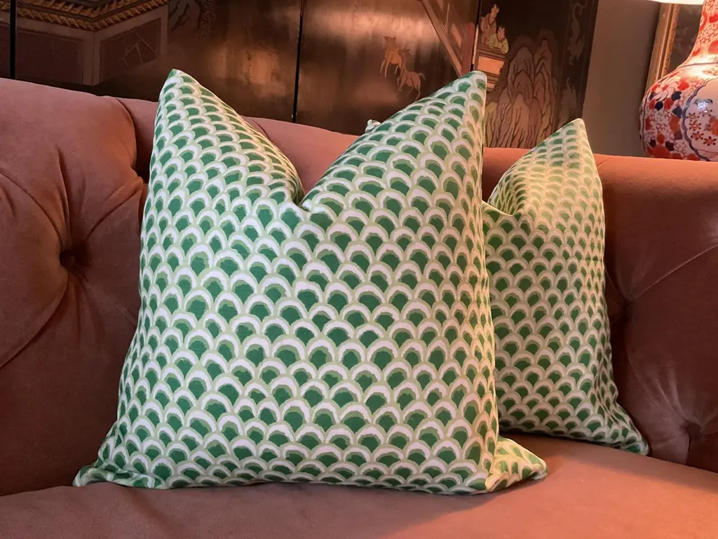 New HOT and fun fabric from Brunschwig and Fils! This fabulous cotton print, Pave II in Green has been fashioned into gorgeous pillow covers! Reminiscent of seashells, this on trend fabric is sure to please. Covers will feature Pave II on both sides. Message me for more color options!These will come as a 22in pair with plush down inserts.ABOUT ACCENT MARKS PRODUCTS: Each pillow is handmade with the highest quality fabrics and overstuffed for a full, comfy feel. Pillows are shipped USPS unless otherwise requested. Please contact Accent Marks for a custom order!We always offer samples if there is ever a question on color or texture.Due to the custom nature of our work, we are unable to accept returns or exchanges. Please contact me with any questions or concerns.