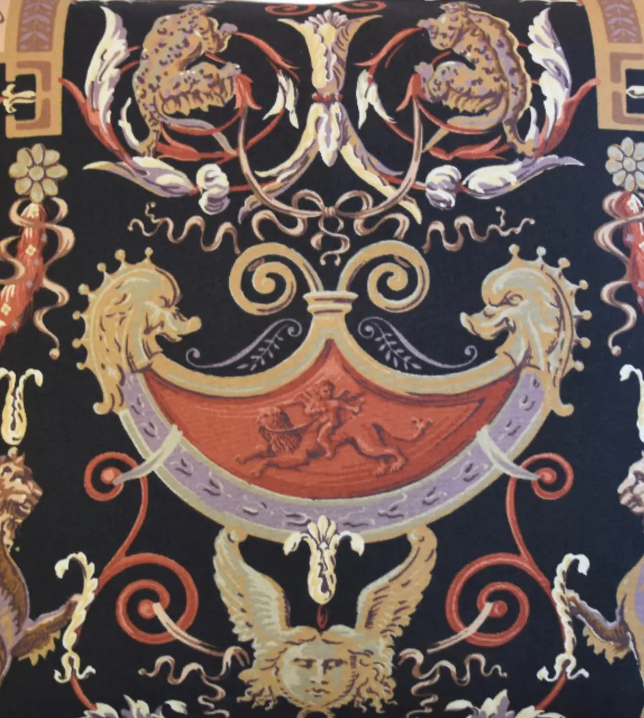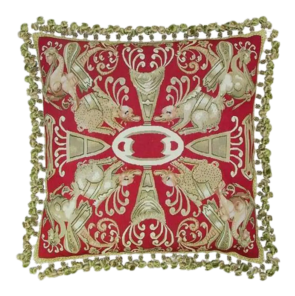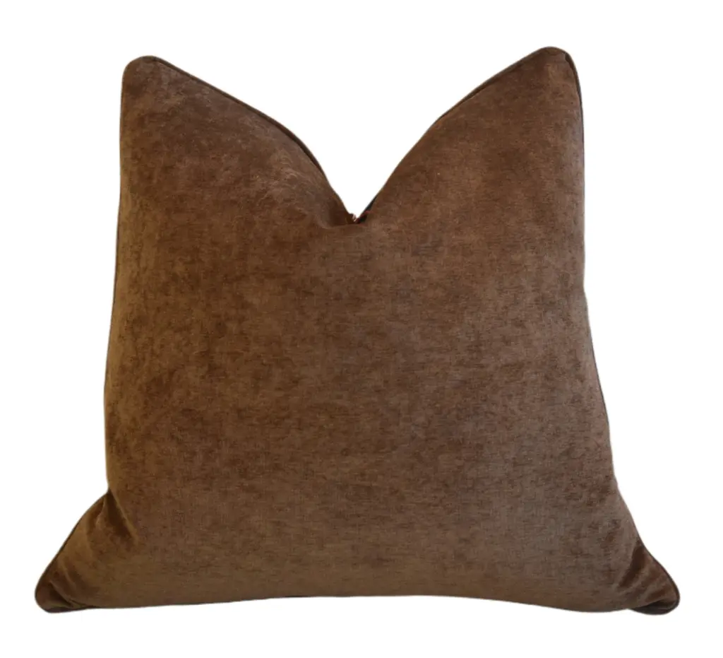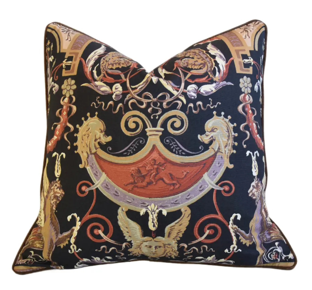 Custom-tailored pillow in Brunschwig & Fils cotton fabric with a beautiful, royal Italian Venetian scrolling theme. Brown-colored cotton-velvet fabric back. Custom velvet piping cord trim. Zipper closure. All pillows in this listing have an identical pattern layout. New plump goose feather-and-down insert. Excellent new, unused condition!!!!