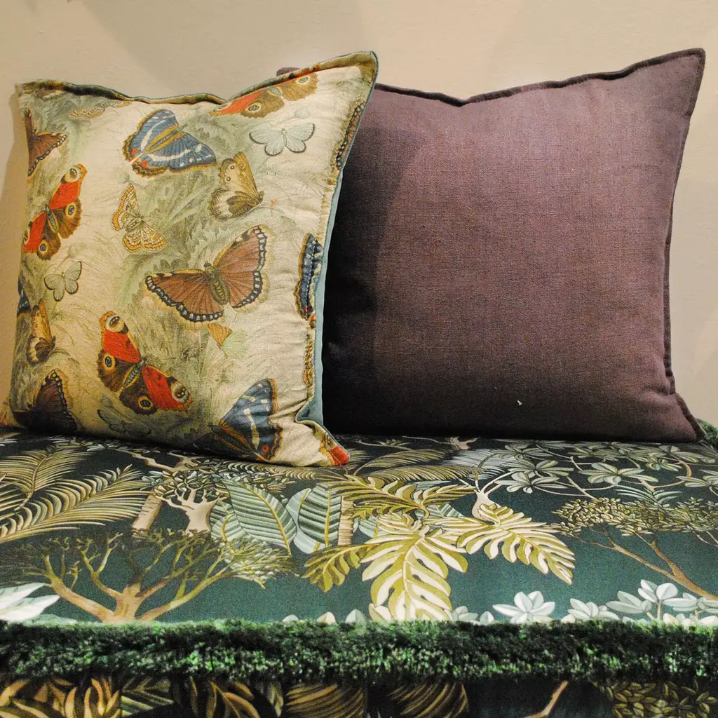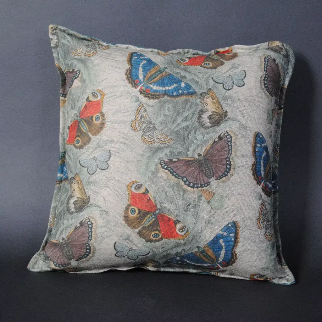 This superb cushion will accent a modern sofa, bed, or plush armchair with its alluring romantic personality. Providing a soft feel from the fine blue velvet covering one side, and from the fresh linen covering the other side, the cushion stands out for the motif of multicolor butterflies set against its ecru-dyed linen side. The edges feature a soft hem, completing the design.