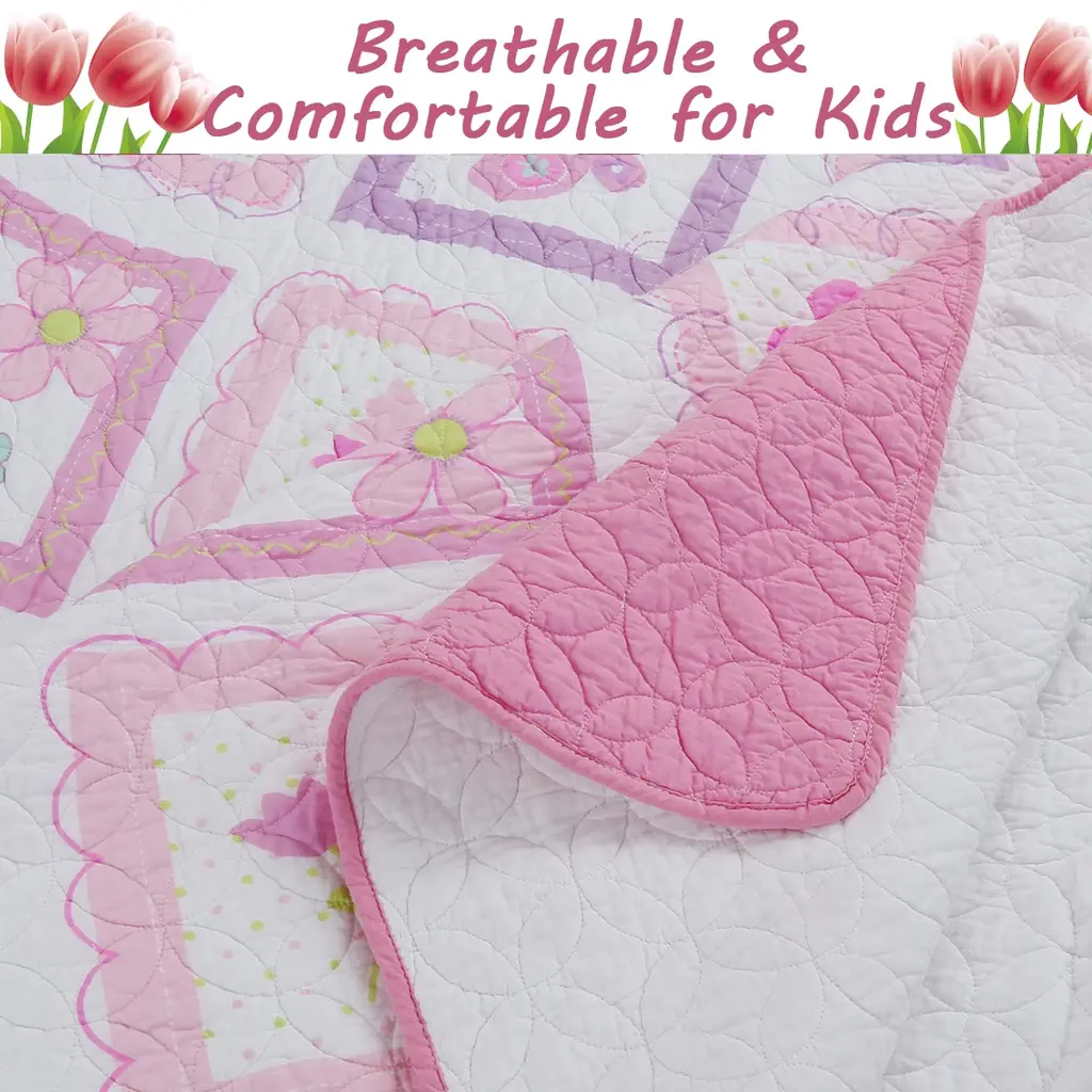 Surprise your little girl with the fun beauty of this quilt set. The butterfly-inspired style in pink, purple, and white is perfect for whimsical bedrooms, while the 100-percent cotton materials provide breathable comfort and convenient machine-washable cleaning. This sham-and-quilt set offers a coordinated look for easy decorating. The set is available twin with and without decor throw pillows, to fit your bedding needs and is machine washable for easy care. Twin Dimensions:· Twin Quilt: 68 inches wide x 86 inches long· 1 Standard Sham: 20 inches wide x 26 inches longDecor Pillow Approximate Dimensions:The digital images we display have the most accurate color possible. However, due to differences in computer monitors, we cannot be responsible for variations in color between the actual product and your screen.