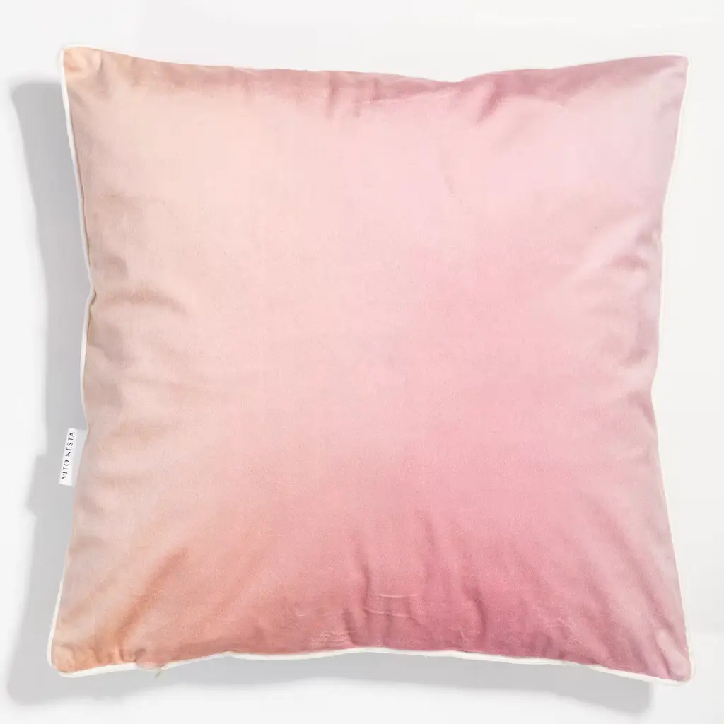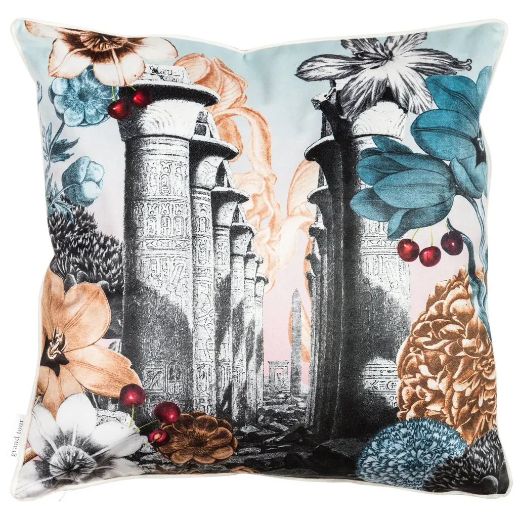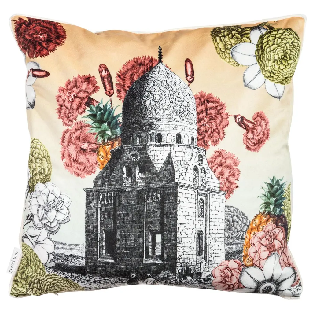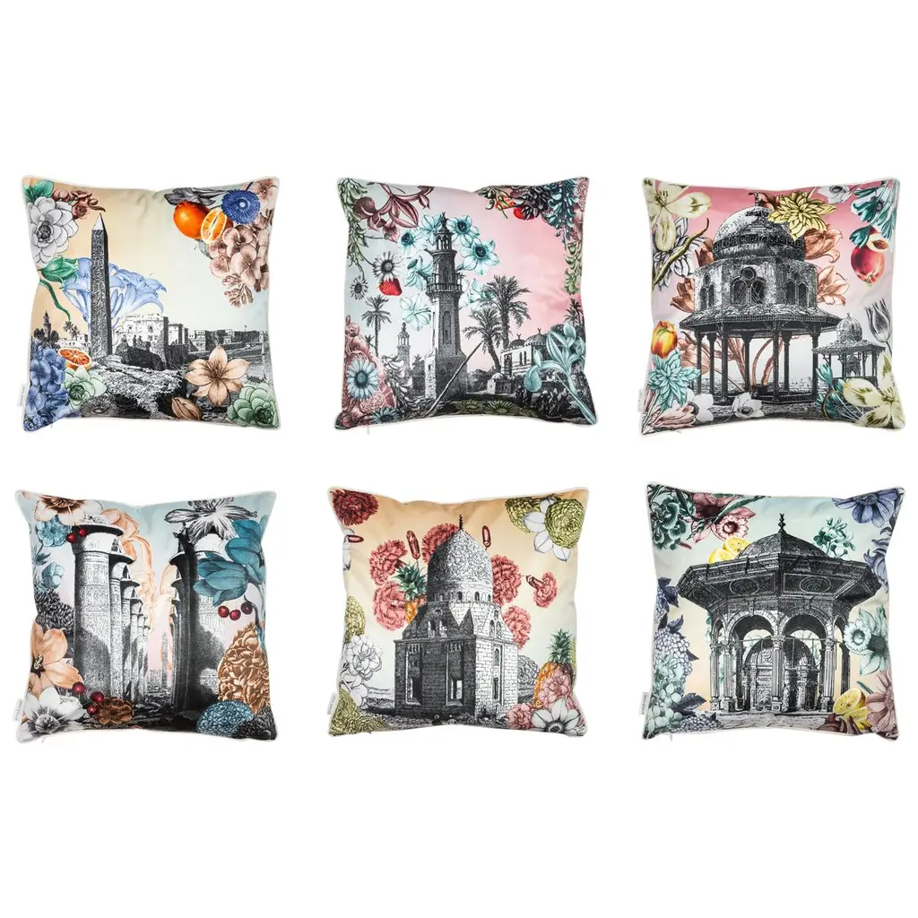 Artisan Vito Nesta's travels have inspired this series of velvet cushions. The black and white images of exotic locations are superimposed onto colorful flower print backgrounds add a joyfully eclectic accent to any room. The delicate structure depicted on this cushion seemingly floats amid flowers and soft pastel tones, making it a dreamy addition to a couch or a bed.