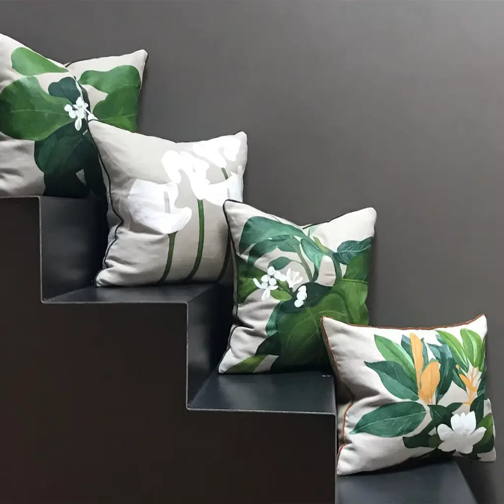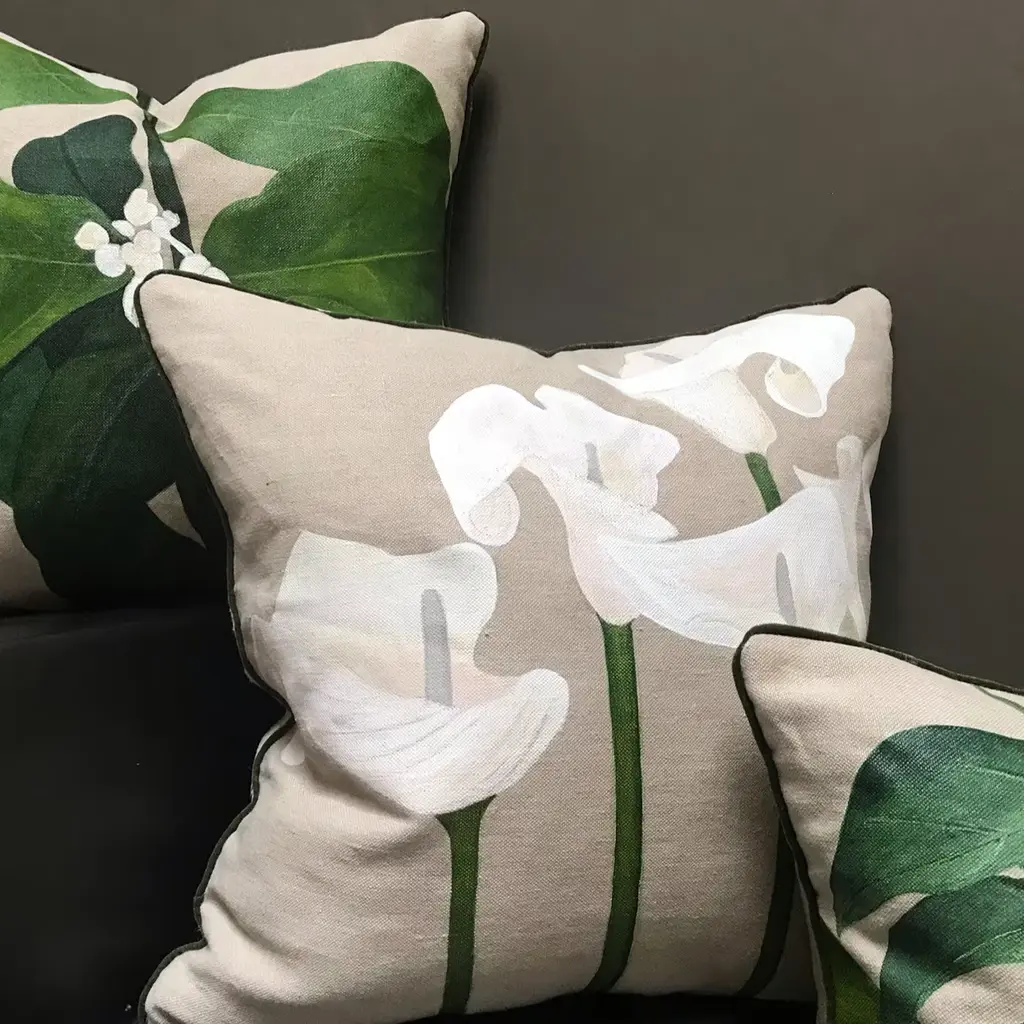 Calle Flowers cushion is part of the Giardino collection. Finely hand painted on Linen. Velvet piping. Silk lining. Back of the cushion can be in different material. Limited edition. Giardino is a collection inspired by the beauty and grace of flowers. The spirit of the collection is to create a blend between images from Italian countryside and British gardens. Flowers, plants, leaves are reinvented and interpreted in a modern and creative way.