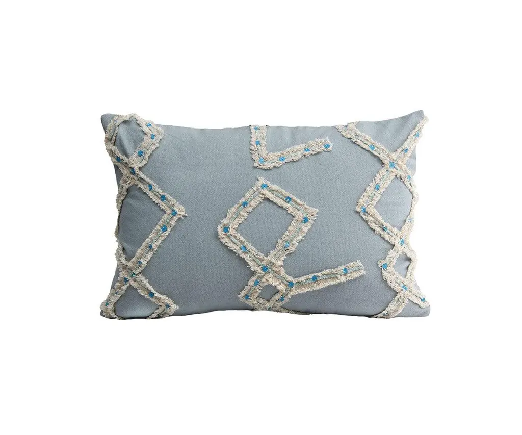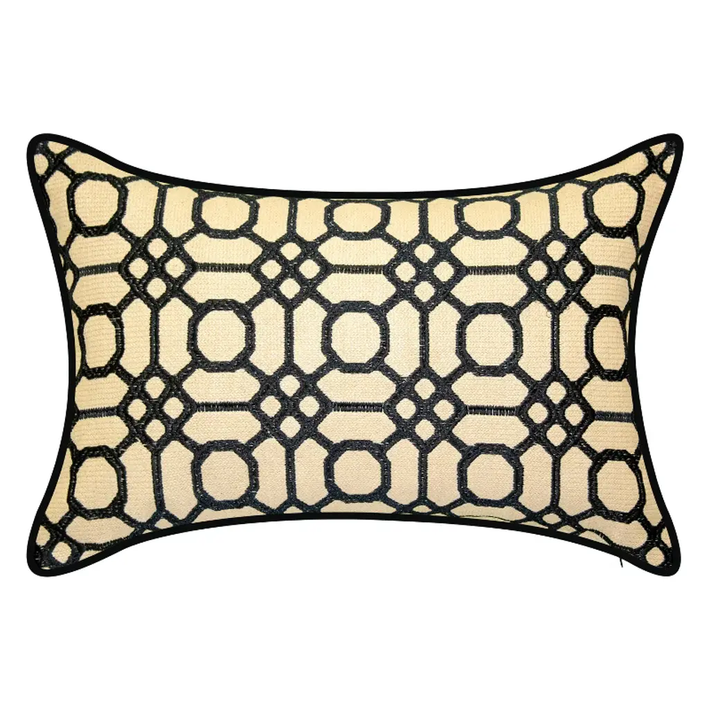 Decorative pillow with a geometric embroidered pattern. Self-backed in a luxurious fabric. Knife edge finish. Pillow insert included. Zipper closure for easy care. Dry clean only.