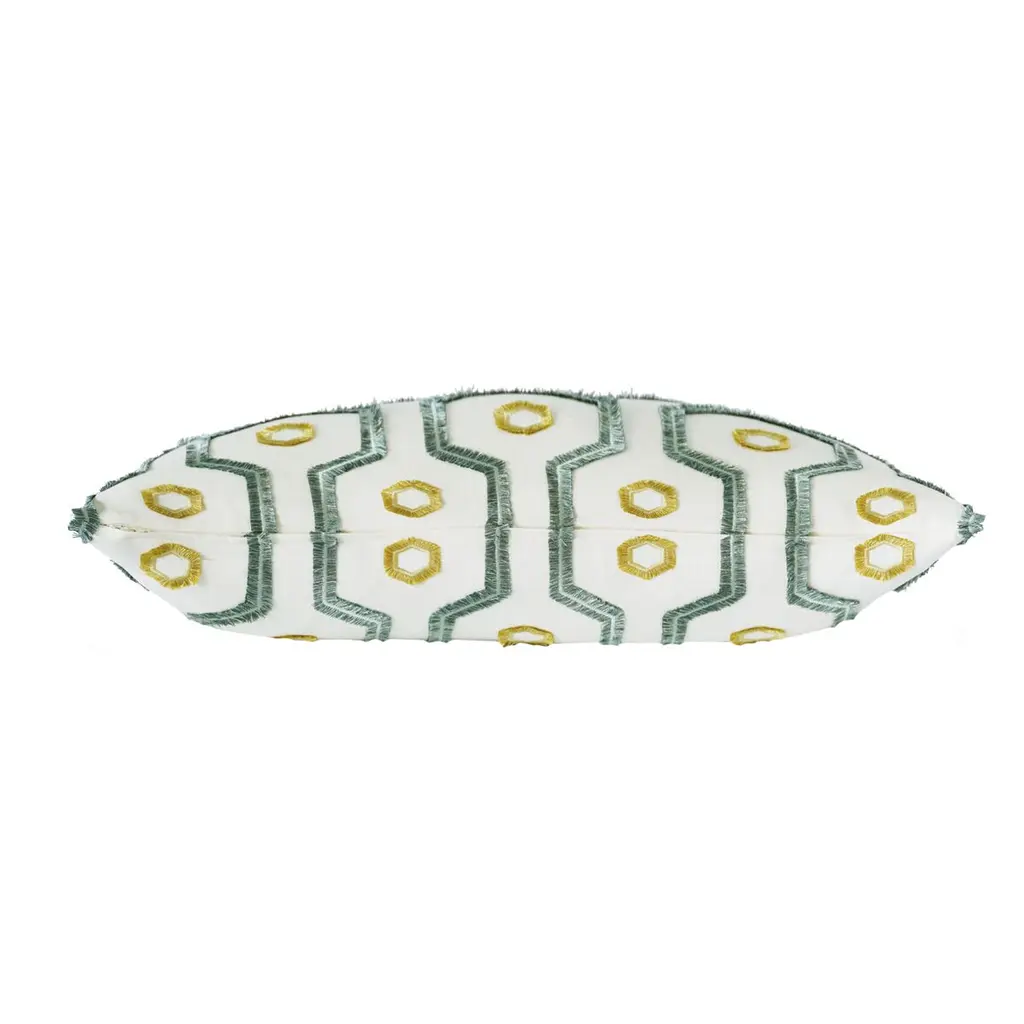Decorative pillow with a geometric embroidered pattern. Self-backed in a luxurious fabric. Knife edge finish. Pillow insert included. Zipper closure for easy care. Dry clean only.