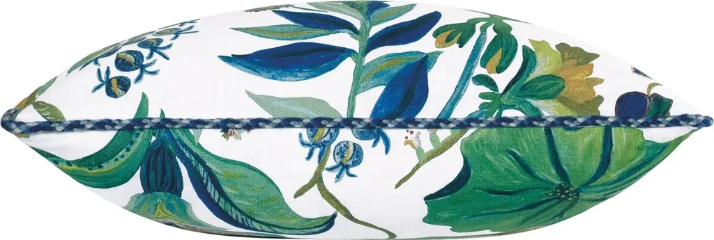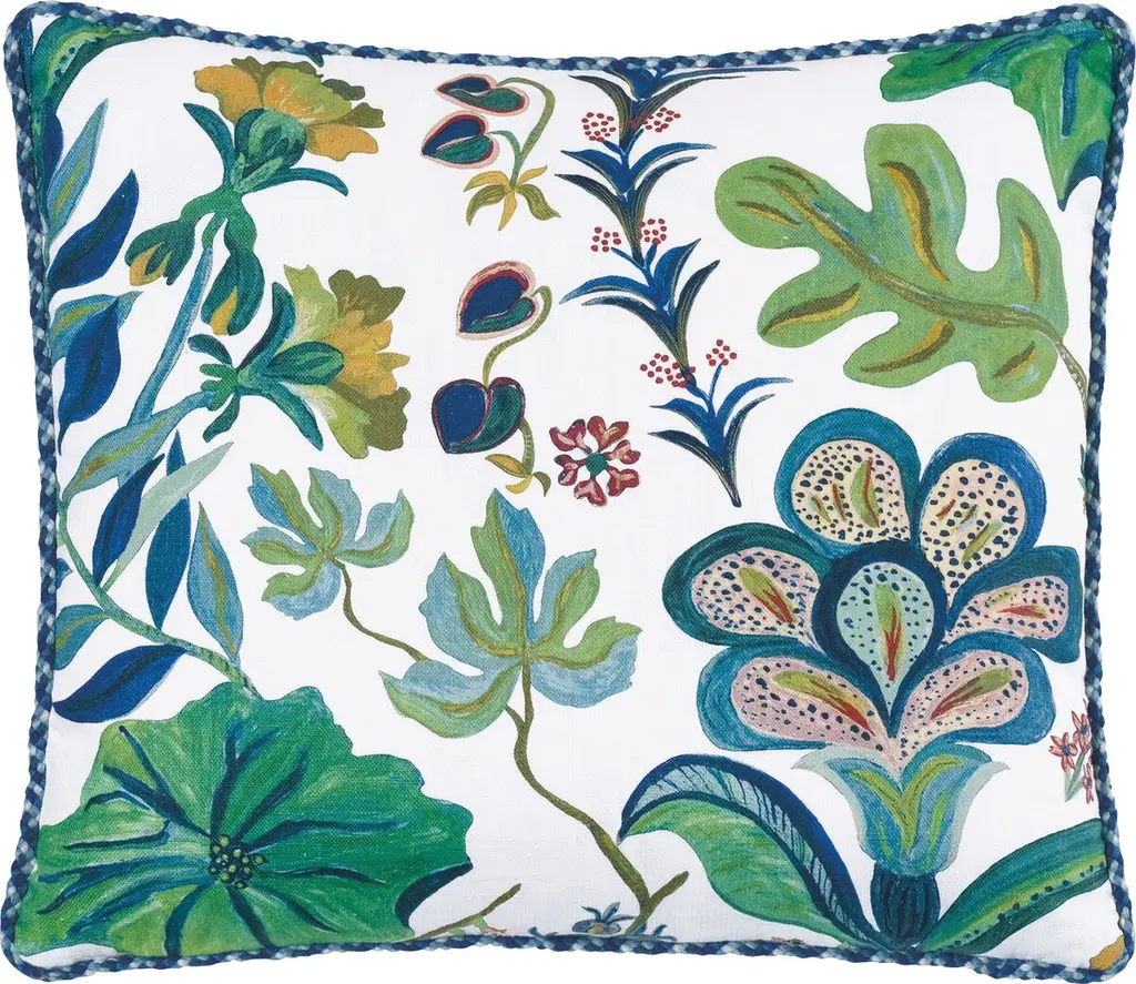 Fanciful flowers adorn both sides of this cotton-linen throw pillow designed by Alexa Hampton. Braided cord trim adds finesse. Made in the USA, the pillow has generous plume feather fill for lush comfort. Hidden zipper closure.