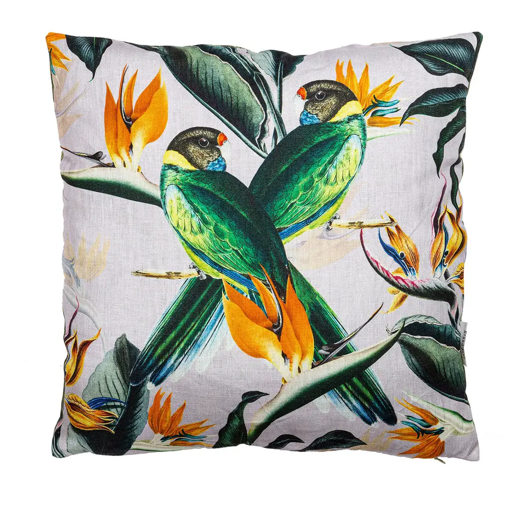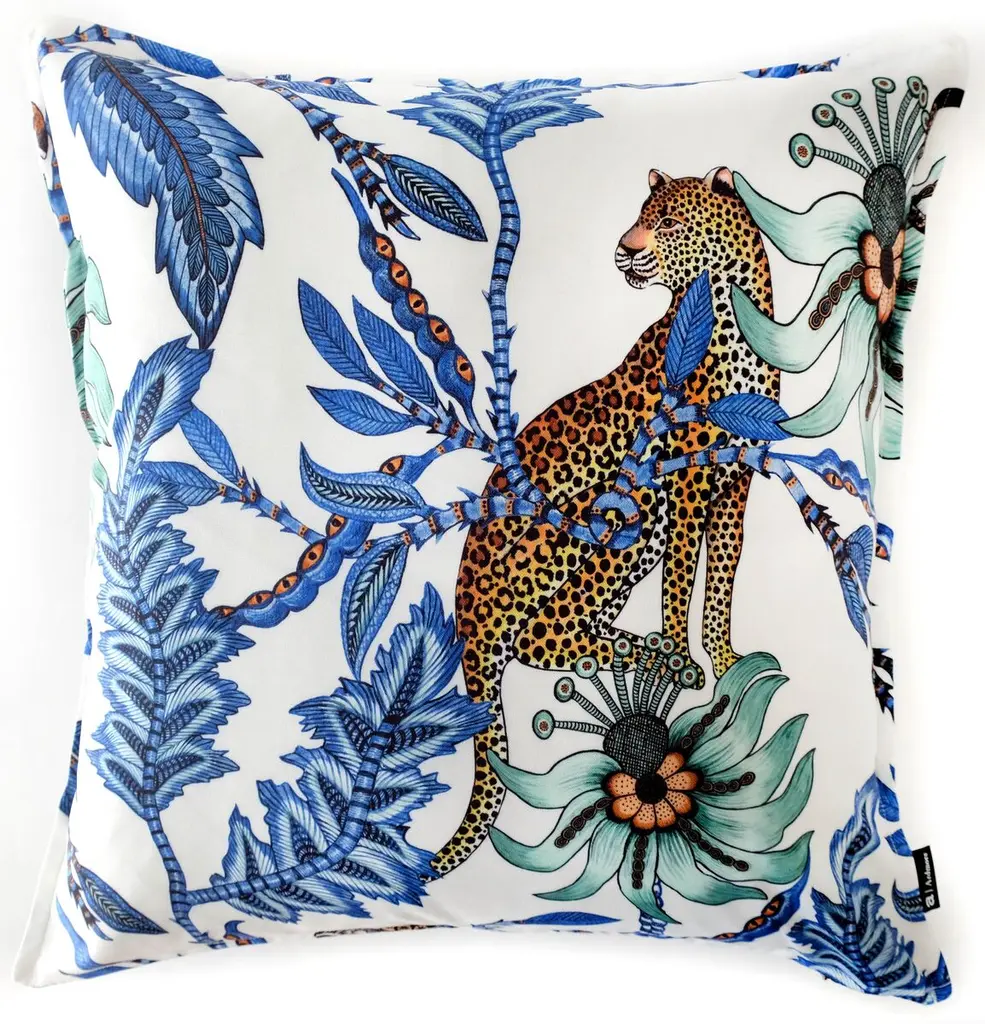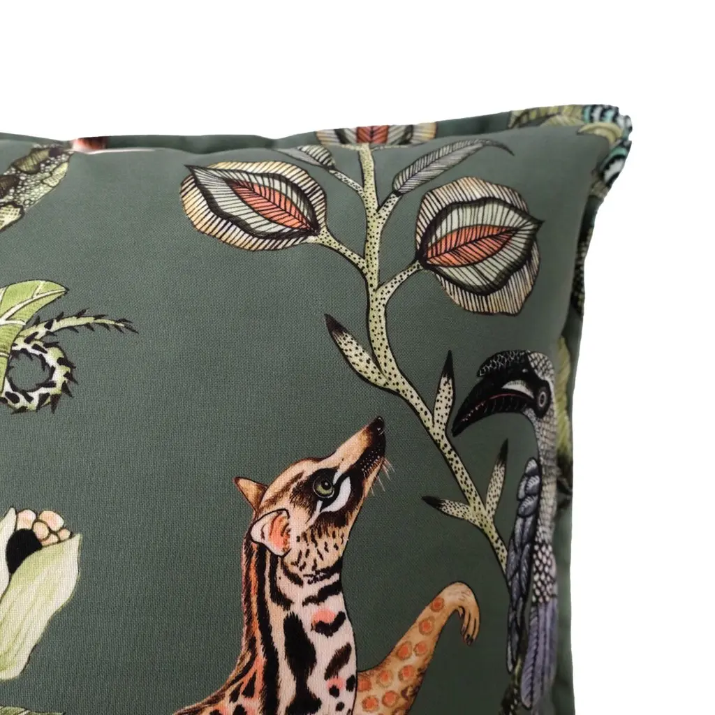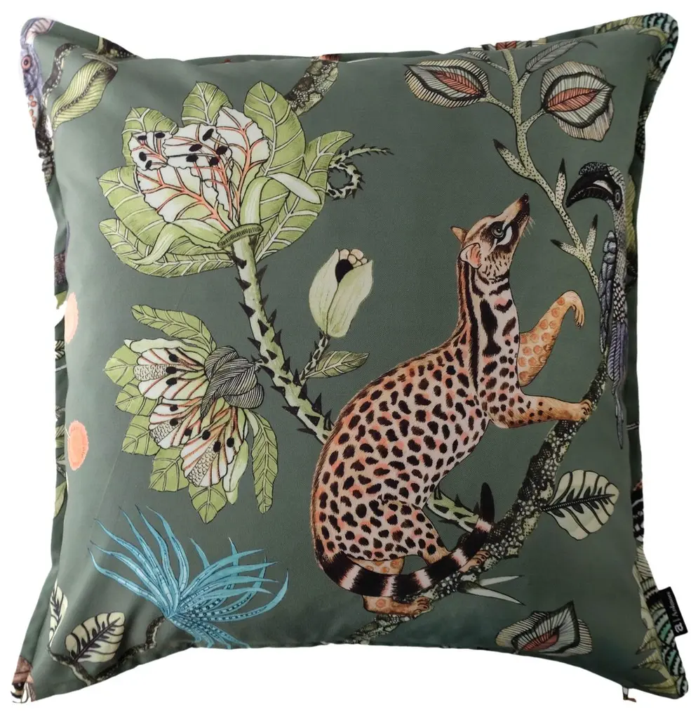Suitable for use outdoors as well as inside, this pillow features on both sides a lively print inspired by the birds, bush babies, and other small animals that spend their nights among the flora surrounding South Africa's Sabie River. Zipper closure.