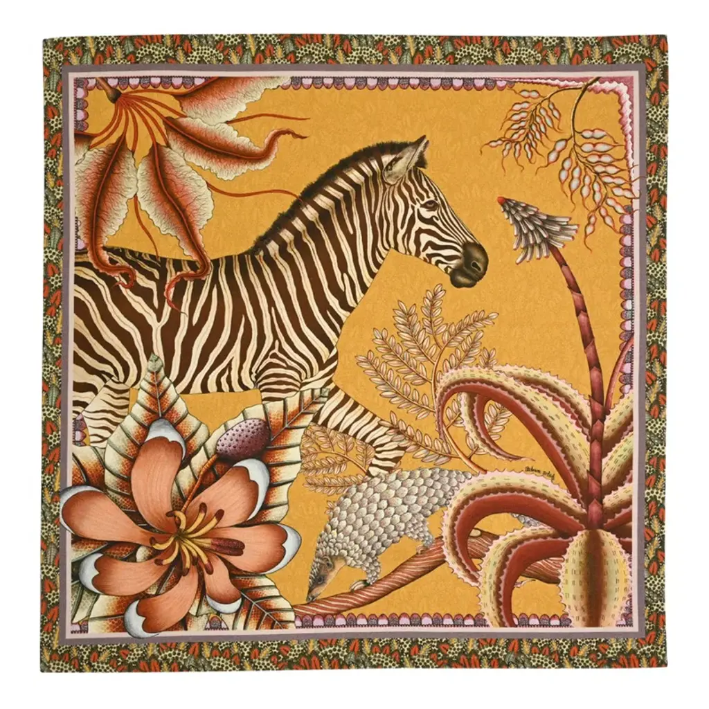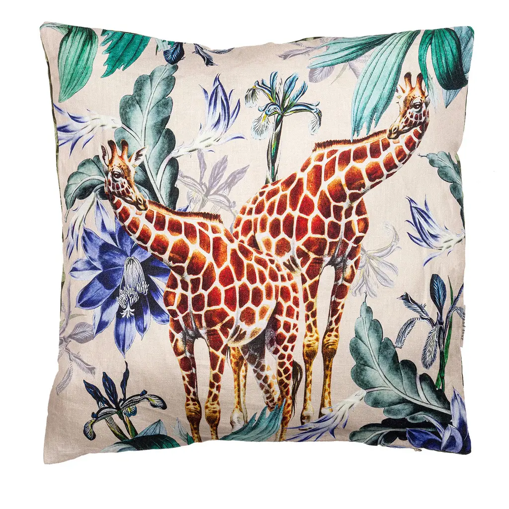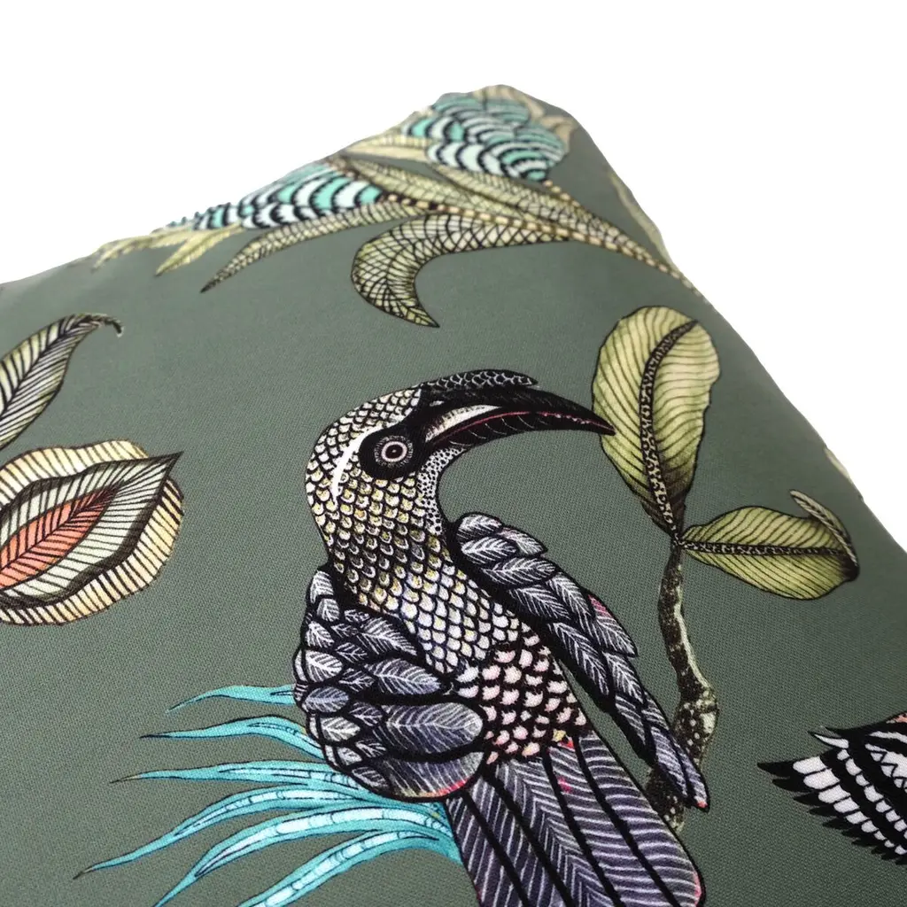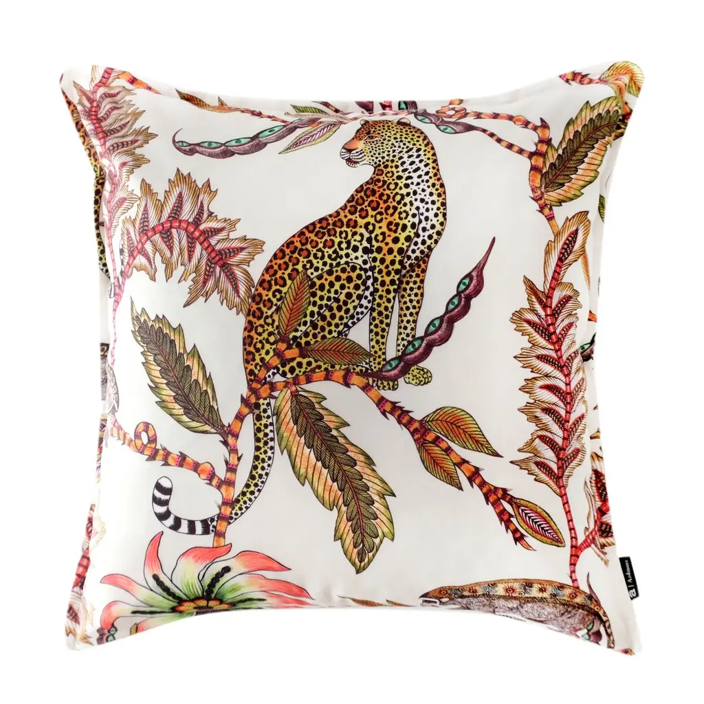 Suitable for use outdoors as well as inside, this pillow features on both sides a lively print inspired by the birds, bush babies, and other small animals that spend their nights among the flora surrounding South Africa's Sabie River. Zipper closure.
