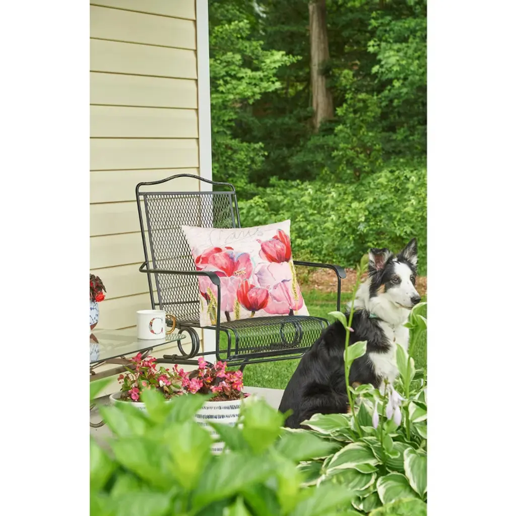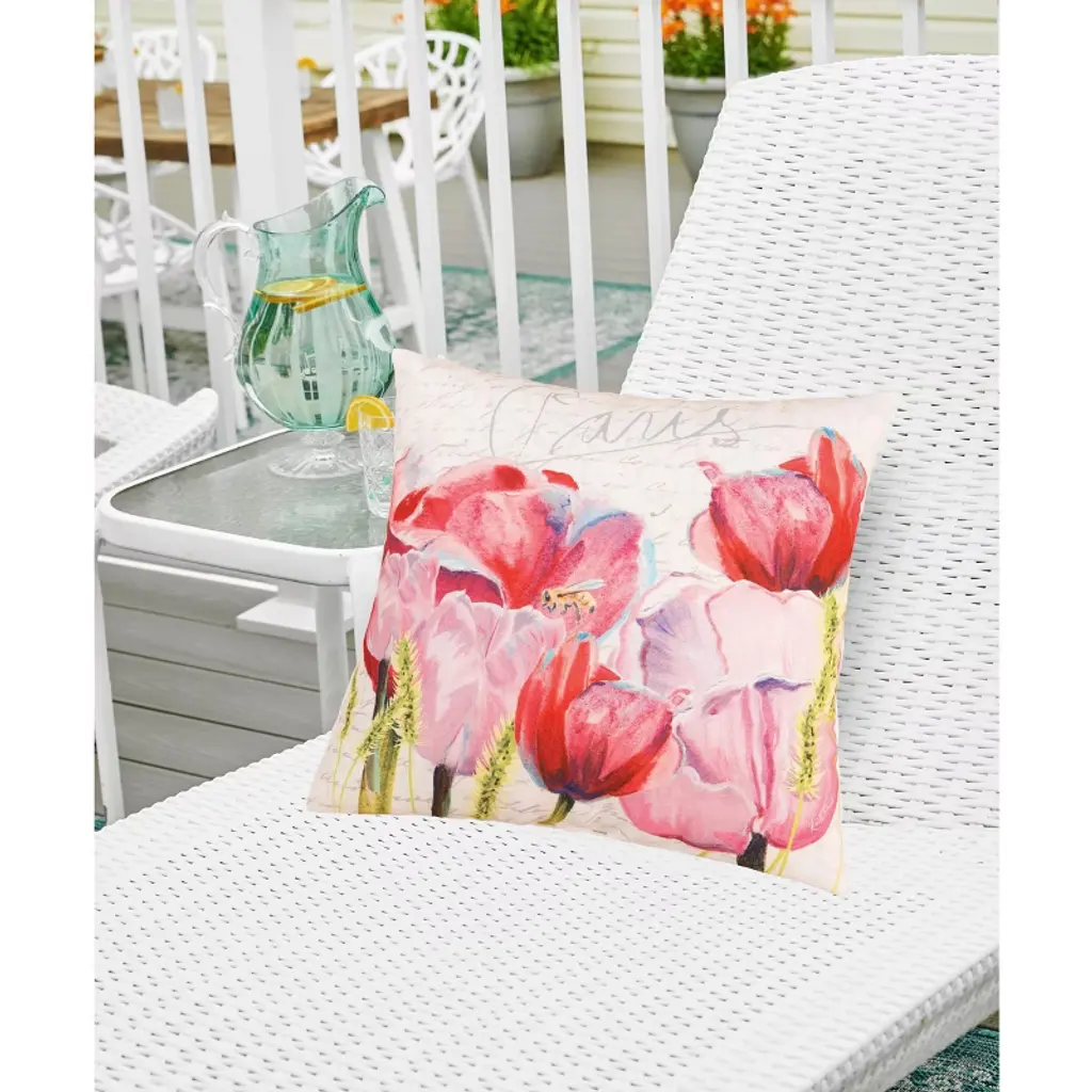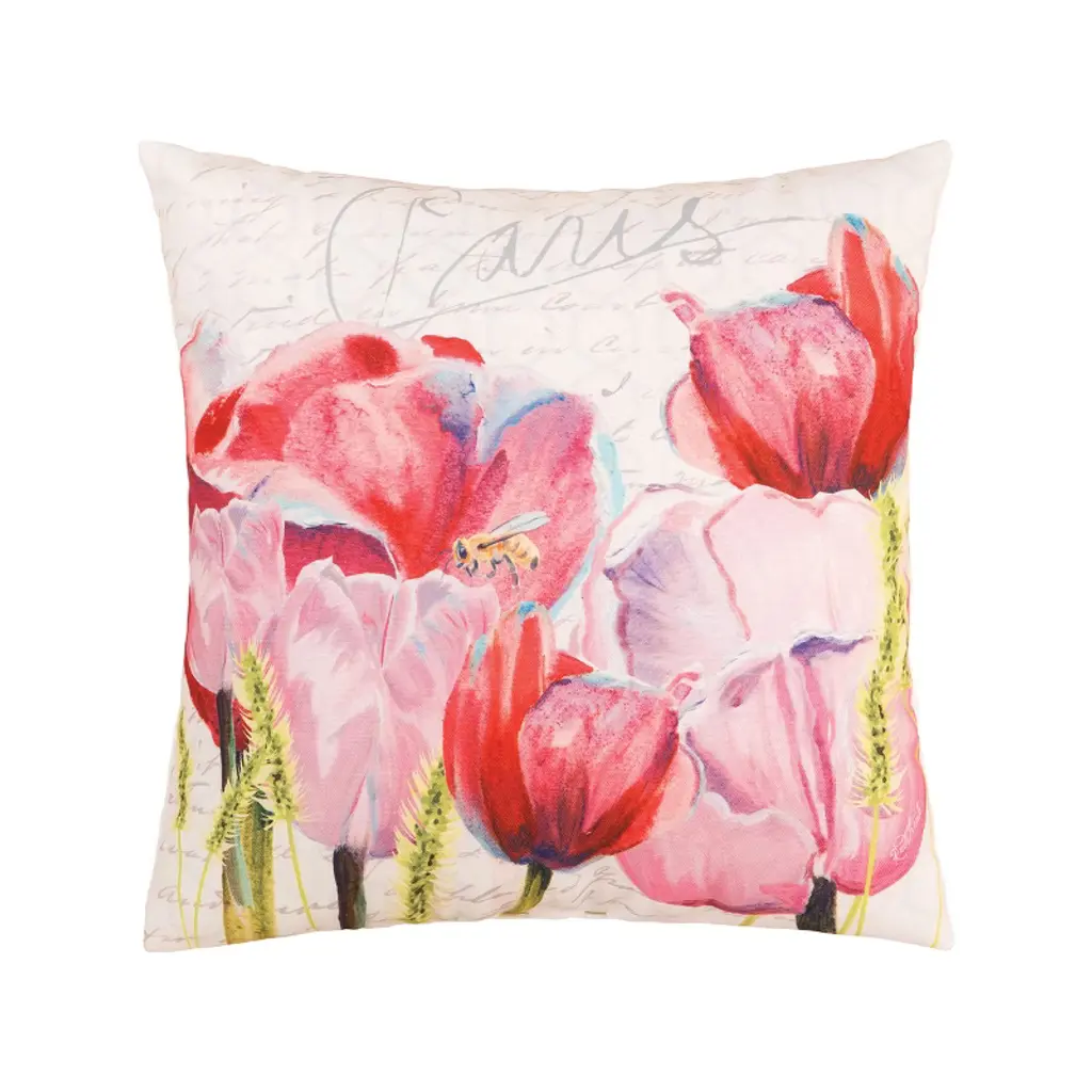 Take your indoor style outdoors with C&F Home's indoor/outdoor pillows. Featuring a field of bright pink tulips and elegant script writing, reminiscent of spring in Paris. Created in collaboration with artist Jennifer Redstreake, this pillow will bring a pop of color and sunshine to any space. From crisp nights on the patio to sunny springtime bedrooms, the design possibilities are endless. Fade resistant, this pillow is crafted with a soft polyester cover and polyfill for plushness and quick drying. Spot cleaning recommended.