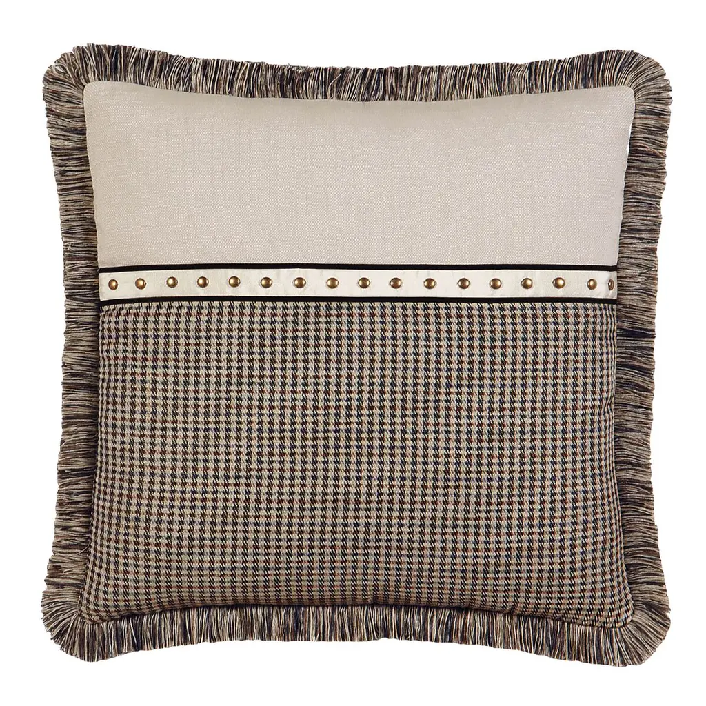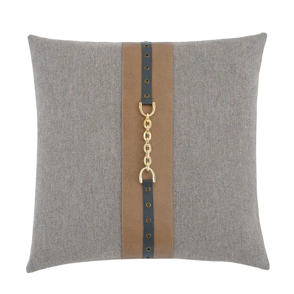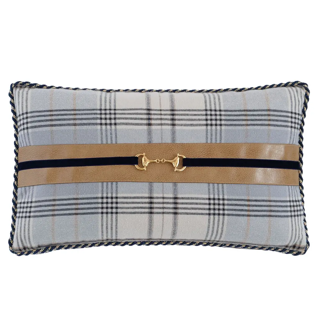 Exclusive to One Kings Lane: An effortless way to bring equestrian chic to a sofa, chaise, or bed, the front of this pillow features a houndstooth print accented with contrasting ribbon and a golden belt buckle. The feather fill ensures luxe loftiness. Solid back. Zipper closure.