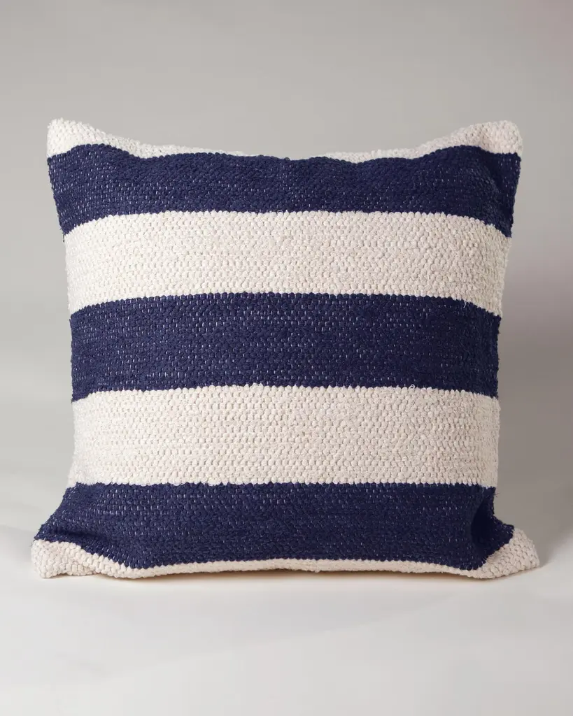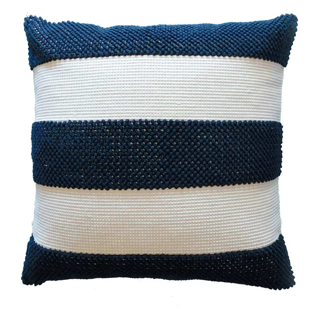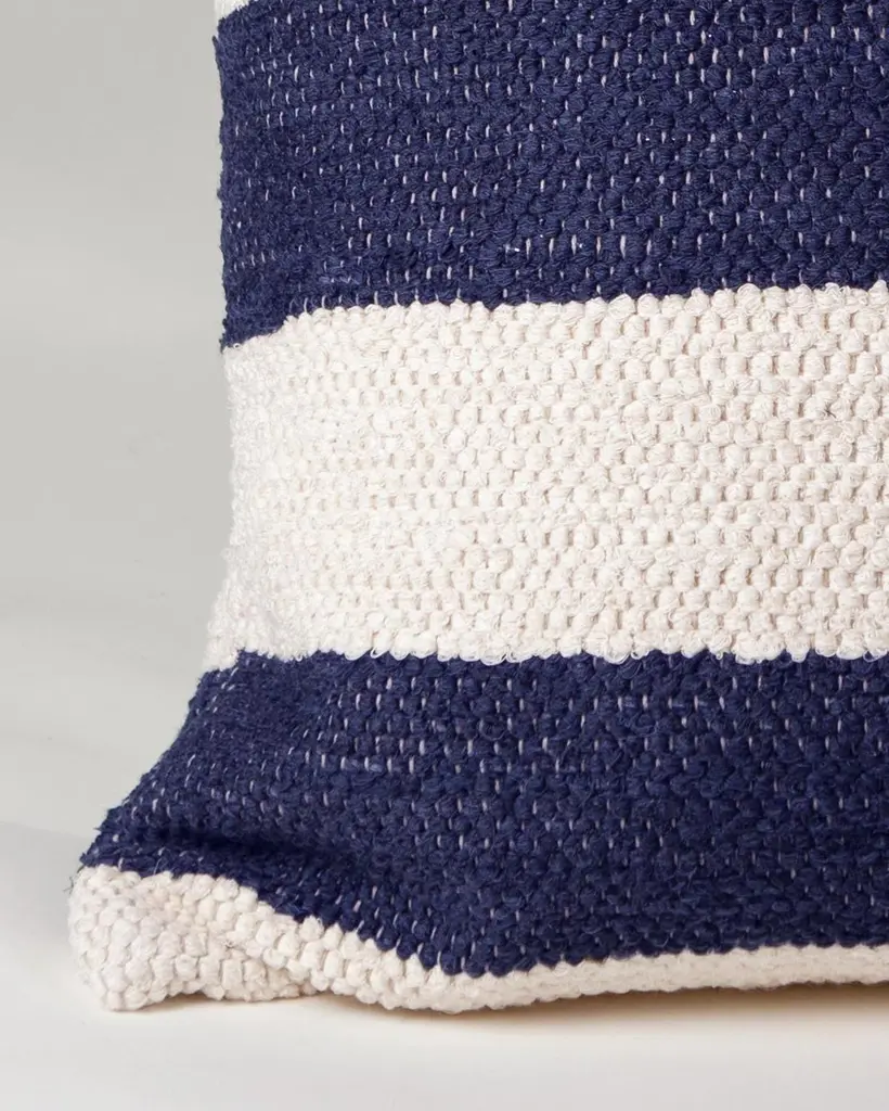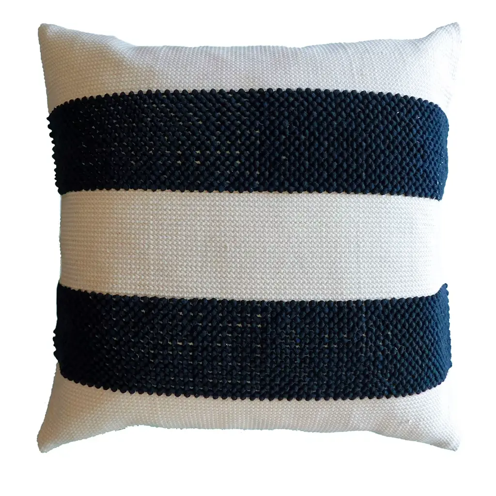 This navy and cream cotton throw pillow is made from thick handwoven cotton and is perfect for a high traffic area like the living room couch. Put two matching pillows on either side of the couch or get multiple patterns in the same color. The minimalist geometric design is perfect for blending seamlessly into your design scheme and the neutral color complement almost any home decor. These pillows also work great on a daybed or the bed in your bedroom.This throw pillow is handwoven from 100% recycled cotton left over from the fashion industry in Southern Portugal. This hand woven throw pillow will look stylish in any Mid-Century modern or contemporary home, and adds a touch of rustic charm to any living room couch. Rui and Fernanda are the talented couple behind the small family-owned mill that weaves all of our rugs, ottomans, cushions and wall-hangings. We love their passion, drive and creativity, and watching Rui spin yarn from dozens of different colours of thread recycled from the fashion industry is a thing to behold.Size: 24" x 24".Insert: 10/90 hypoallergenic duck down/feather premium inserts.Care Instructions:Hand wash pillow cover with cold water and allow to air dry, or dry clean.