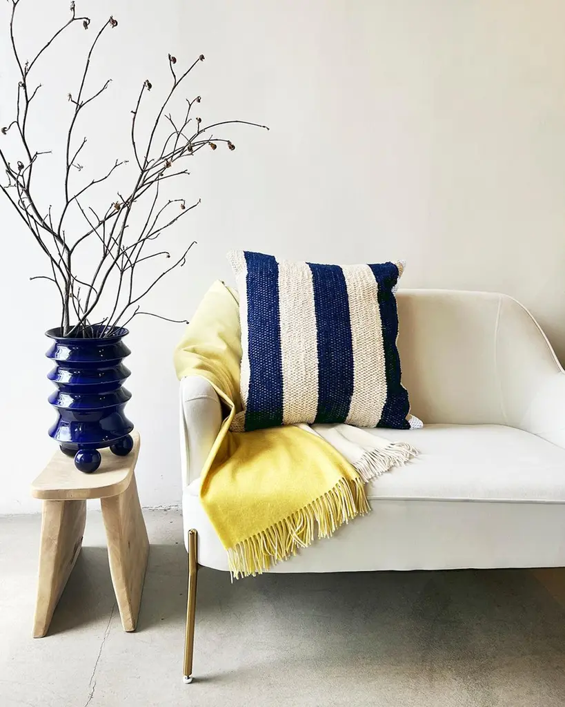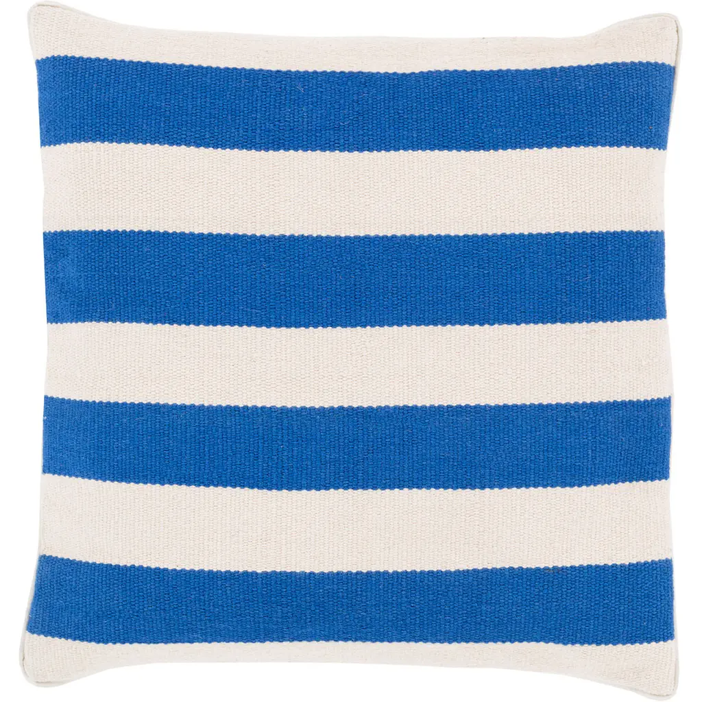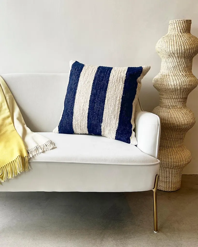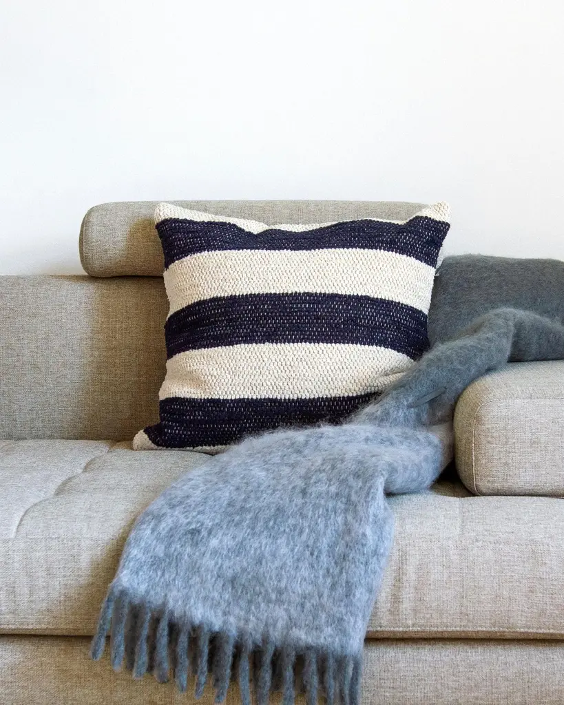 This navy and cream cotton throw pillow is made from thick handwoven cotton and is perfect for a high traffic area like the living room couch. Put two matching pillows on either side of the couch or get multiple patterns in the same color. The minimalist geometric design is perfect for blending seamlessly into your design scheme and the neutral color complement almost any home decor. These pillows also work great on a daybed or the bed in your bedroom.This throw pillow is handwoven from 100% recycled cotton left over from the fashion industry in Southern Portugal. This hand woven throw pillow will look stylish in any Mid-Century modern or contemporary home, and adds a touch of rustic charm to any living room couch. Rui and Fernanda are the talented couple behind the small family-owned mill that weaves all of our rugs, ottomans, cushions and wall-hangings. We love their passion, drive and creativity, and watching Rui spin yarn from dozens of different colours of thread recycled from the fashion industry is a thing to behold.Size: 24" x 24".Insert: 10/90 hypoallergenic duck down/feather premium inserts.Care Instructions:Hand wash pillow cover with cold water and allow to air dry, or dry clean.