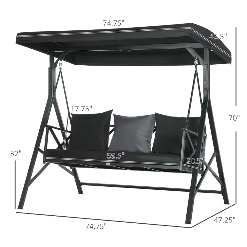 The CAVINAS porch swing is perfect for enjoying quality time outdoors with family or friends. With a spacious 59.5" seat length and a 660 lbs. weight capacity, this swing can comfortably seat up to three adults. The tilting sunshade canopy offers adjustable shade to keep you cool and protect you from the sun, while ensuring your seat remains clean and free from debris. A padded cushion and three throw pillows provide extra comfort, making it perfect for relaxing. Built with a strong, powder-coated steel A-frame and non-slip footpads, it’s designed for outdoor durability. Easy assembly. Weight capacity: 660 lbs.