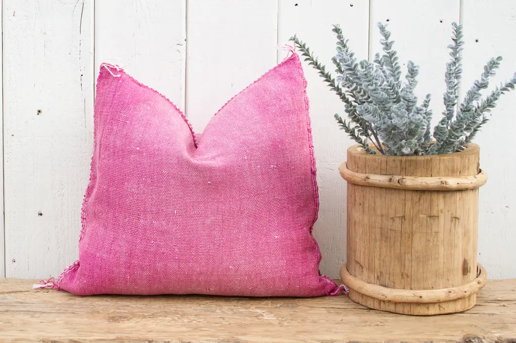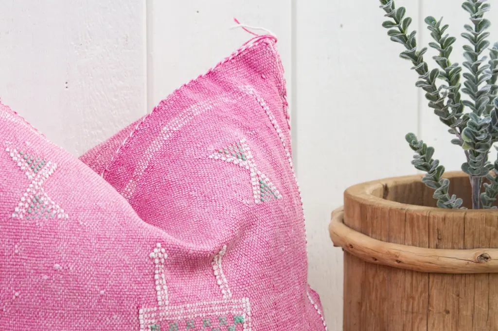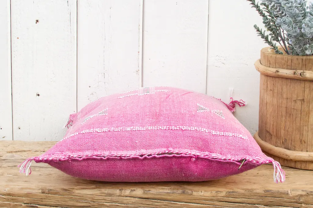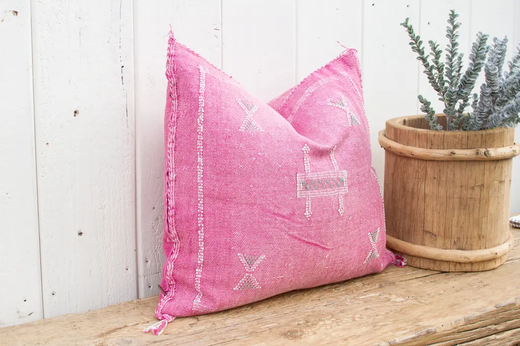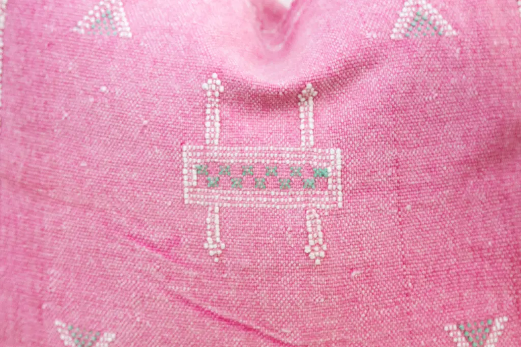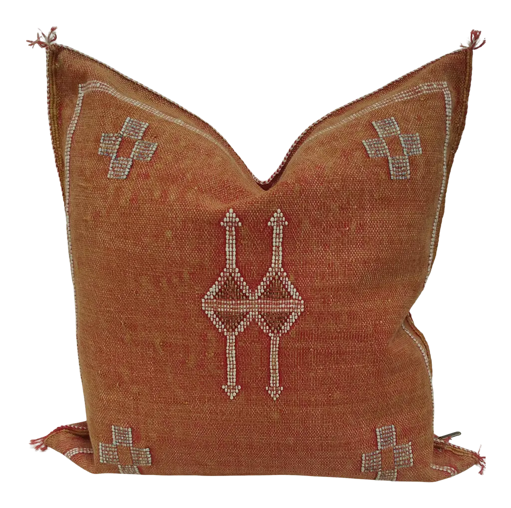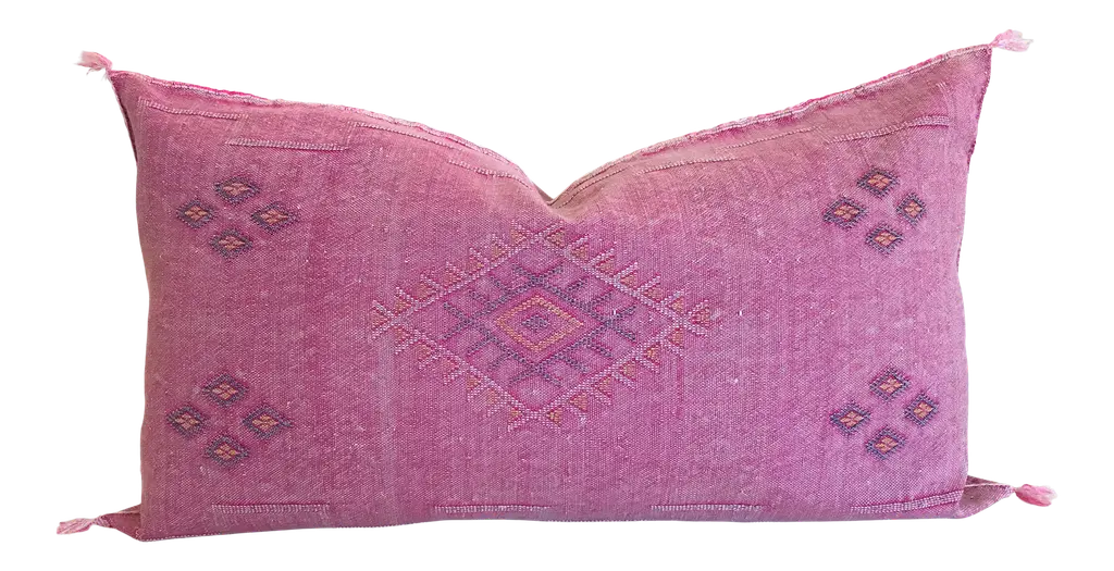 This gorgeous pillow is entirely hand-woven from silk that comes from a Sabra cactus plant. Every pillow is beautifully embroidered with a unique tribal motif that varies from every other pillow. Each pillow is dyed using vegetable dye using a special hand dying technique that gives each one their own lovely faded and beautifully aged colors. This pillow has a zipper closure, down blend insert is included.