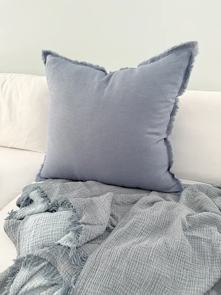 Our Chambray Blue Fringe Blue Linen Pillows is Soo soft- you won’t believe it's 100% linen! This yarn has a slight nub which gives it a beautiful natural texture. Edges have a self-fringe on all sides. Details Front & Back Color: Chambray Blue Front & Back side: 100% Linen (washed) Concealed zipper closure on back side. Hand washing or a delicate cycle with like colored fabrics recommended. Hang to Dry. Made in India Pillows are available in 3 options:Pillow Cover Only, with a Down Alternative insert, or with a Down InsertDown Alternative InsertBenefits: Allergen free, Better back support, Retain their shapeInside Fill: 1.2 denier x1.25" polyester gelOuter Shell: 65% polyester/ 35% white cotton blendMade in the USA Down InsertBenefits: Durable, Easy to fluff and re-style, Retains heatInside Fill: 95% gray duck feathers and 5% goose downOuter Shell: 233-thread count 100% cotton fabric Made in the USA