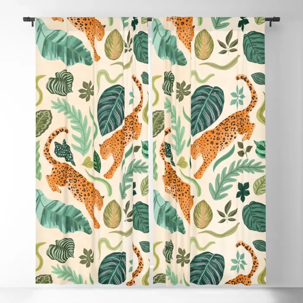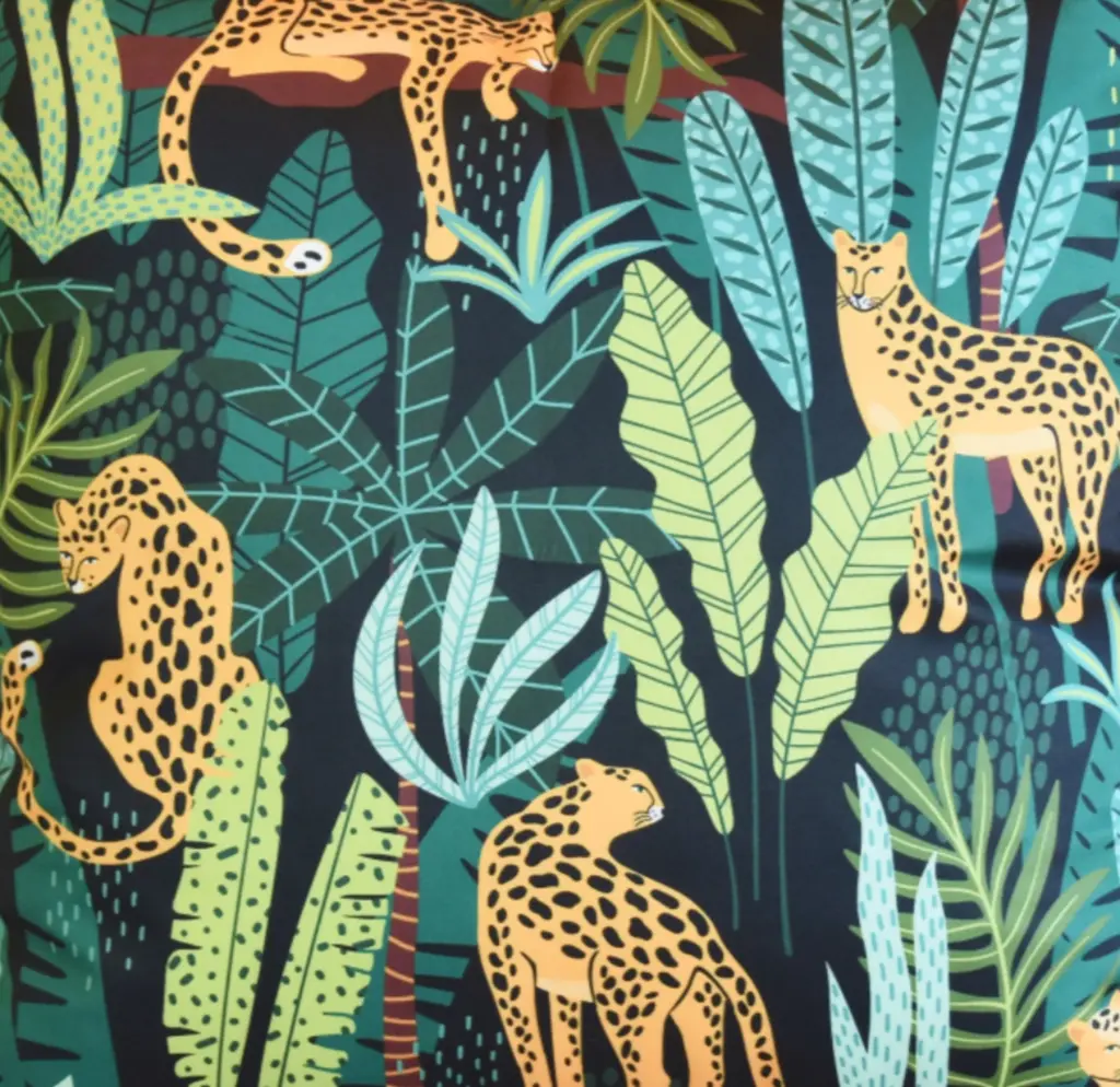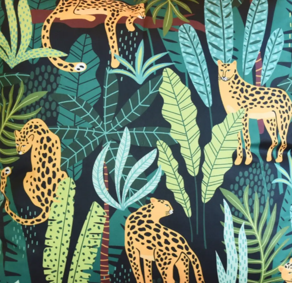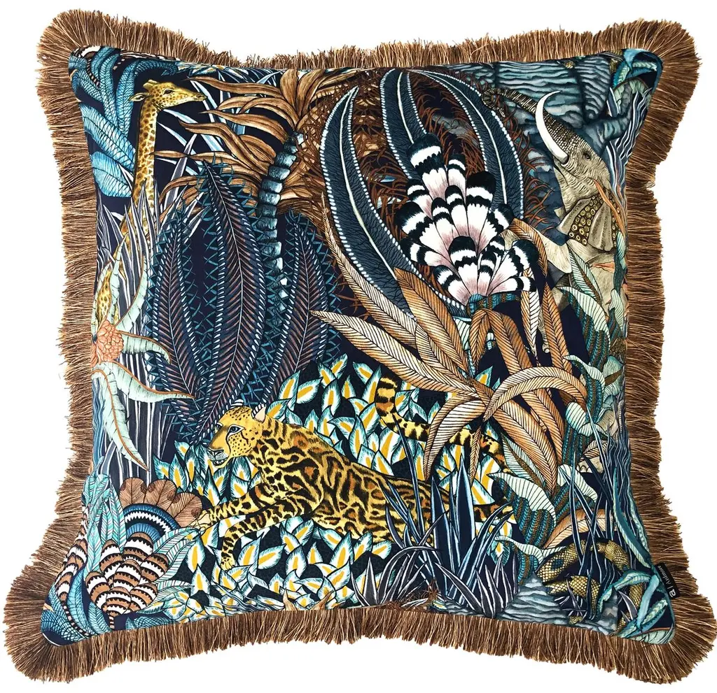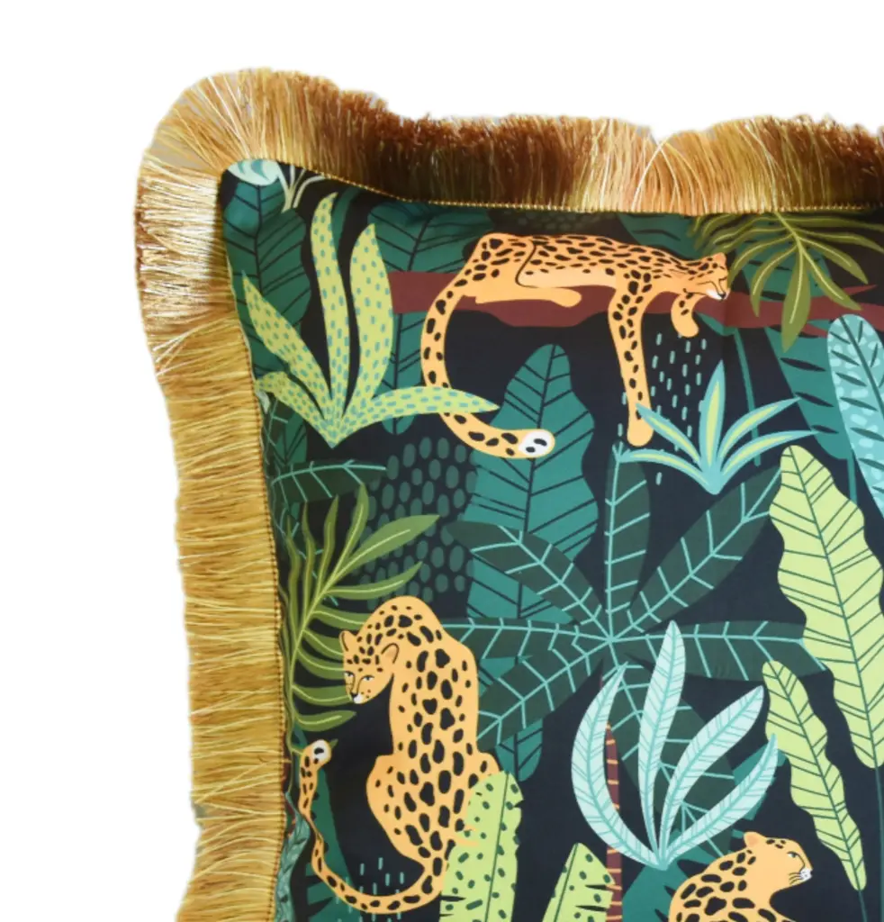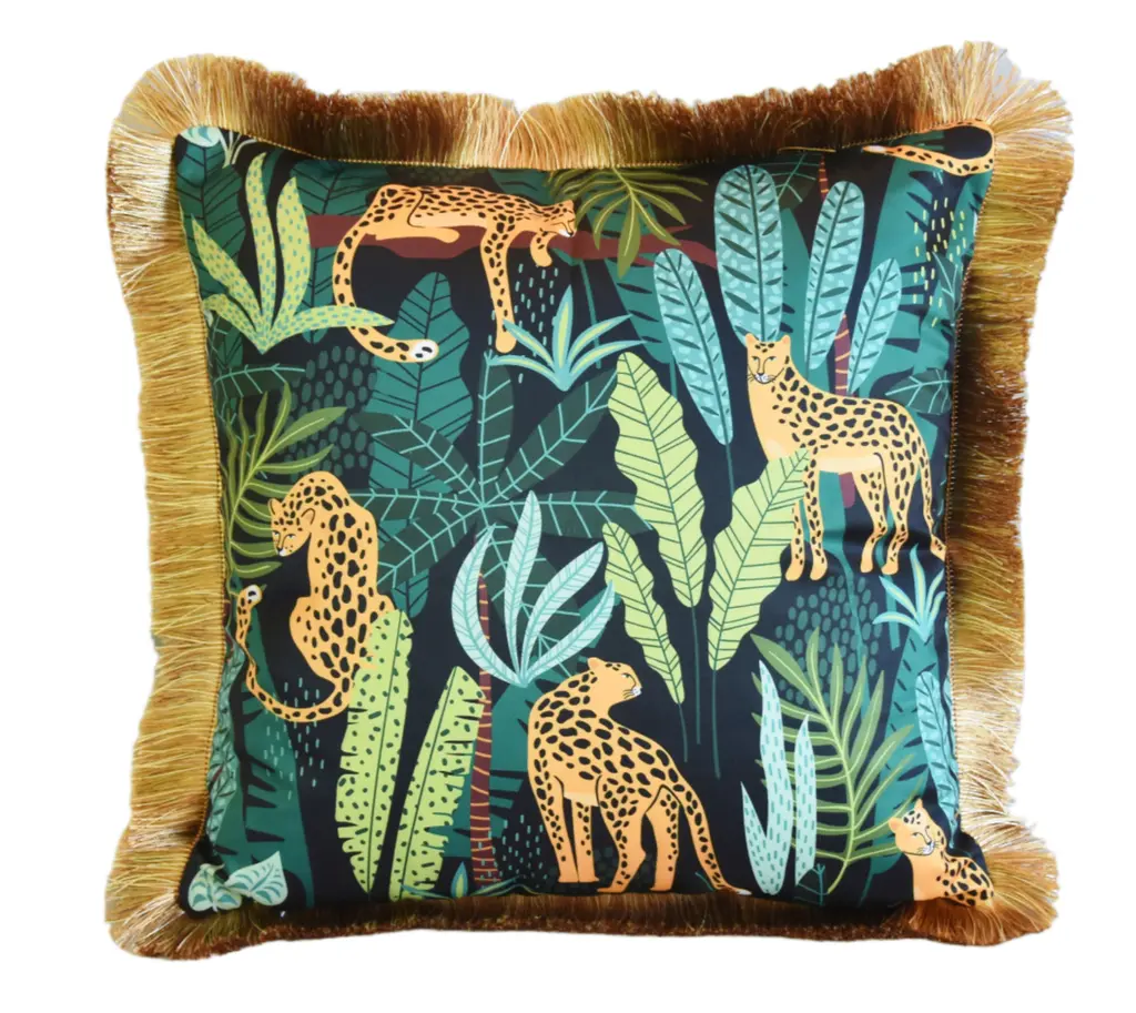 Beautiful custom-tailored pillow in a silk,cotton and Polyester blend fabric depicting a Cheetah Leopard big cat in a botanical jungle design. Same beautiful fabric on the reverse. Hidden zipper closure. Golden brush fringe trim accenting. Plump generous goose down-and-feather insert. The design placement may vary according to the fabric cut. Excellent new unused condition!!