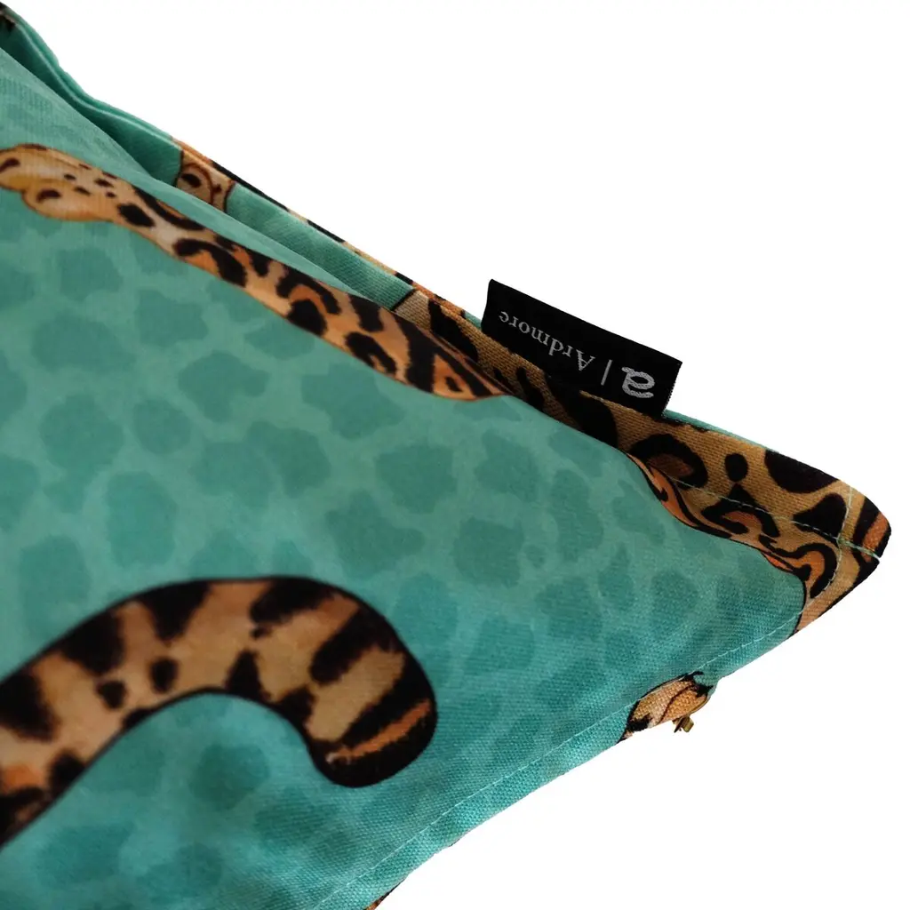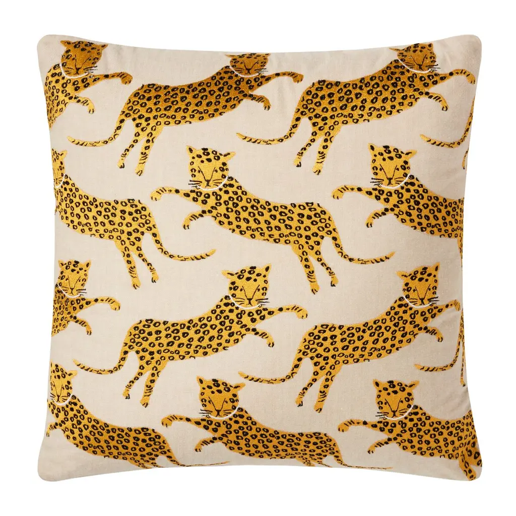 Suitable for outdoor as well as indoor use, this vibrant pillow features cheetahs pouncing against an animal-print background on both sides.