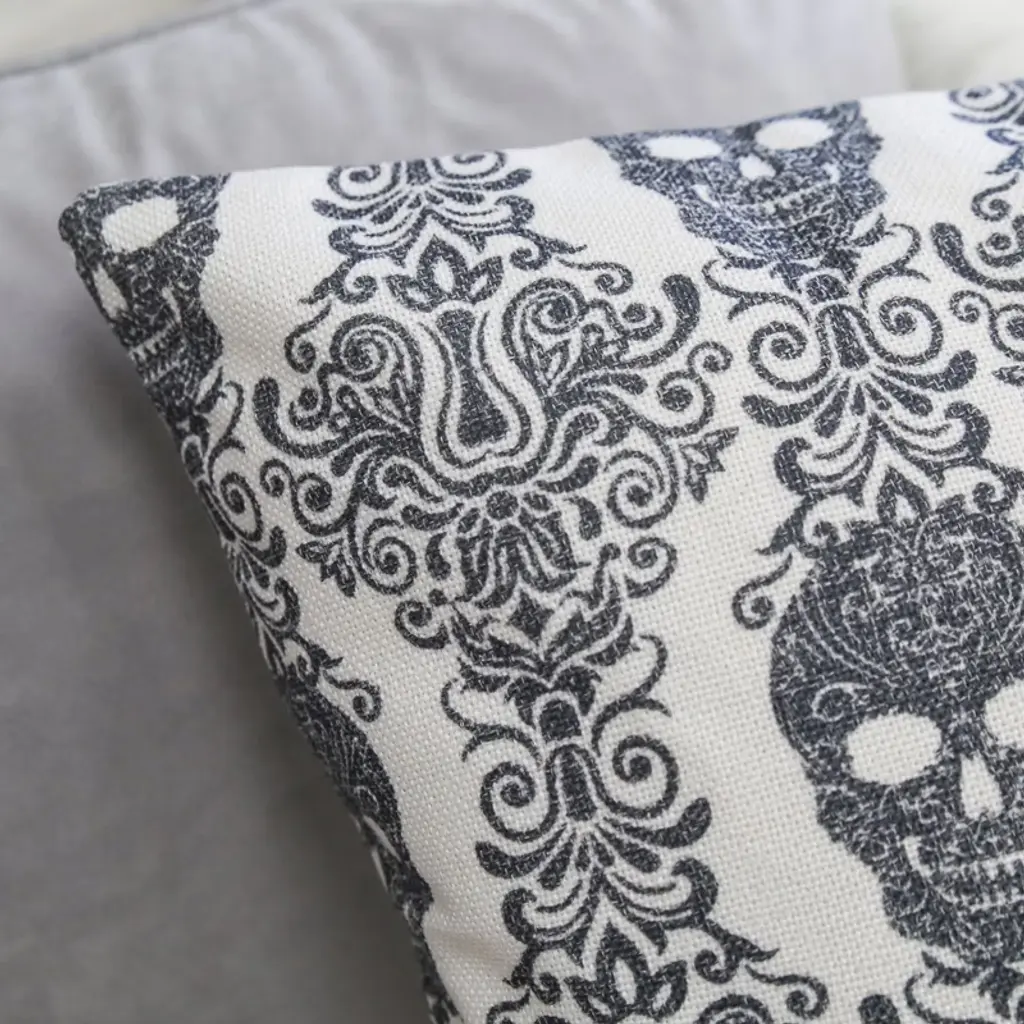 This striking gothic accent pillow (20"x20") features intricately woven skull and baroque patterns on a cotton-linen blend fabric, offering a rugged texture and dramatic visual appeal. With a hidden zipper for easy removal and spot cleaning, it serves as a year-round statement piece or seasonal Halloween decor.