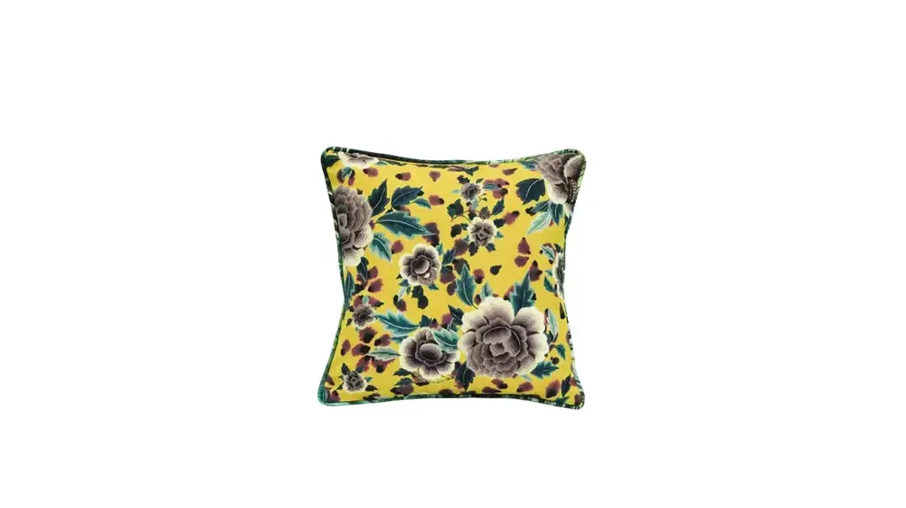 CHINA TOWN fabric cushion front / back. Piping in LES MARQUISES fabric. Removable with special outdoor filling in 100% siliconized hollow polyester fiber 250g in an anti-bacterial, anti-fungal-biopruf polyurethane-coated jersey mesh cover.