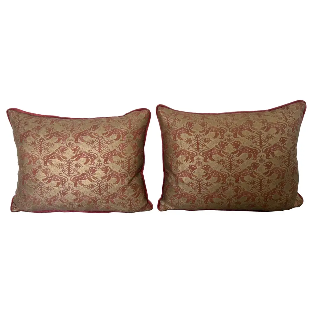 Custom-tailored designer pillow in a chinoiserie printed cotton fabric depicting beautiful, colorful, bold dancing lions. Cream-colored cotton-velvet fabric back. Custom cord trim. Zipper closure. New generous goose down-and-feather insert. Pattern placement may vary according to the fabric cut. Excellent new, unused condition!! ***PLEASE NOTE: I will combine shipping whenever possible if you purchase multiple items from my shop. Warm regards, Mike Seratt. ***Also don't forget to take a peek at my other current listings...you just might find something you can't live without!!! It's easy just click on my name to the right of any listing highlighted in black "Mike Seratt of The Prized Pig" and presto it will bring you to my storefront!!! Cheers!!! Mike Seratt I SHIP OUT IMMEDIATELY, SO THE ESTIMATION YOU SEE FOR THE DELIVERY TIMELINE IS CHAIRISH'S OVERALL GENERAL TIMELINE, BUT I WILL GET THIS OUT THE NEXT DAY AND DELIVERY IS USUALLY 5-7 DAYS AT MOST