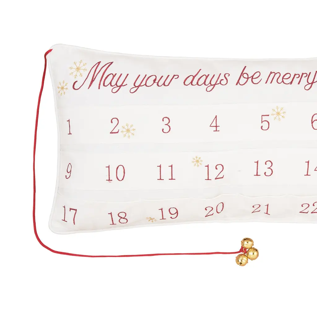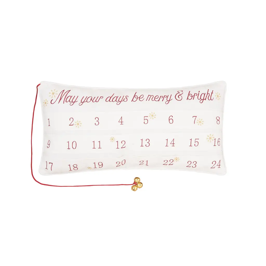 Add a unique Christmas accent to your home with the Merry & Bright Advent Pillow. Featuring a classic Advent calendar embroidered daily countdown pockets with an attached marker of jingle bells, this festive piece will have you counting down the days until Christmas in comfort and style. Crafted with a soft cotton cover, finished with a coordinating piped edge and lofty polyester filling. Spot cleaning recommended. Size: 12-inches x 24-inchesFeatures:A classic Advent calendar embroidered daily countdown pockets with an attached marker of jingle bellsFinished with a coordinating piped edgeCrafted with a 100-percent cotton cover and polyester fillingNon-removable coverFilled and finished in the USASpot Clean