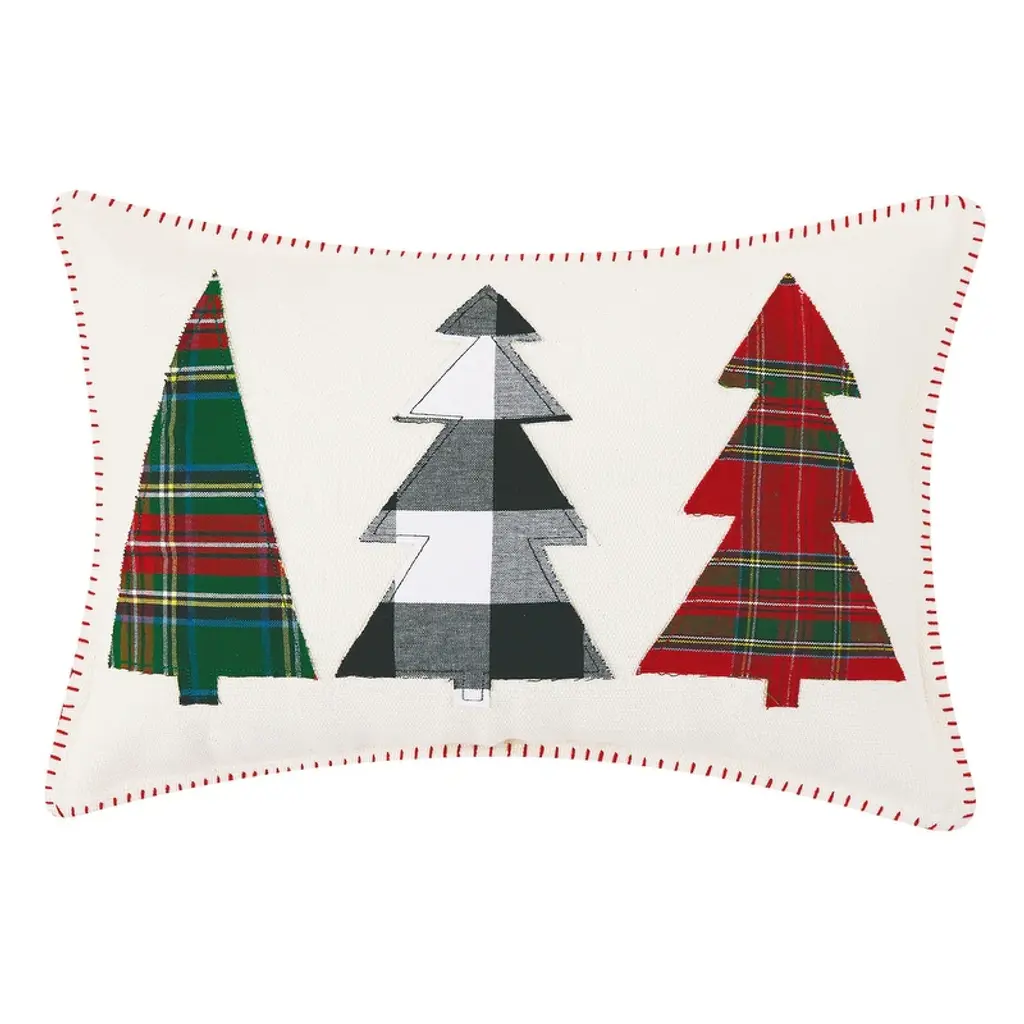 A colorful trio of yarn-dyed plaid trees stand tall against a solid off-white ground made of 100% cotton. The handcrafted look is finished with whipstitch edges and fluffy polyester filling. Place this festive pillow on a favorite chair or sofa for some extra holiday cheer!