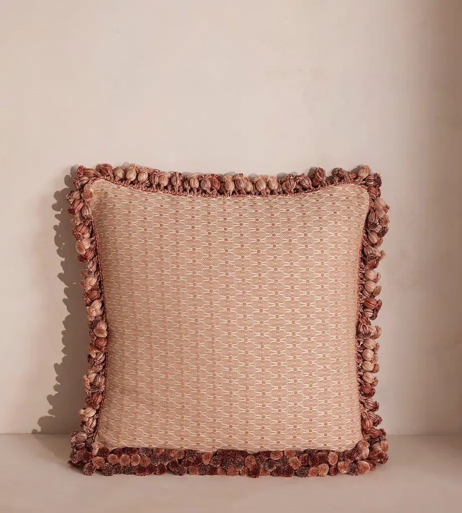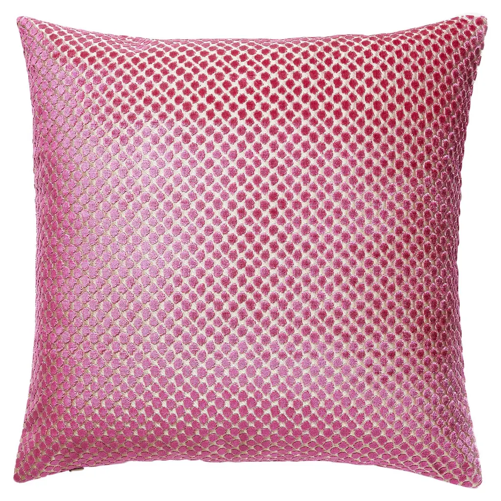The Chrysalis Pillow is a square decorative pillow from India. It features silk chiffon embroidery in tonal pink shades. Made of 100% Silk Velvet, the pillow has a plush and soft texture, adding an elegant touch to any couch, chair, or bed.