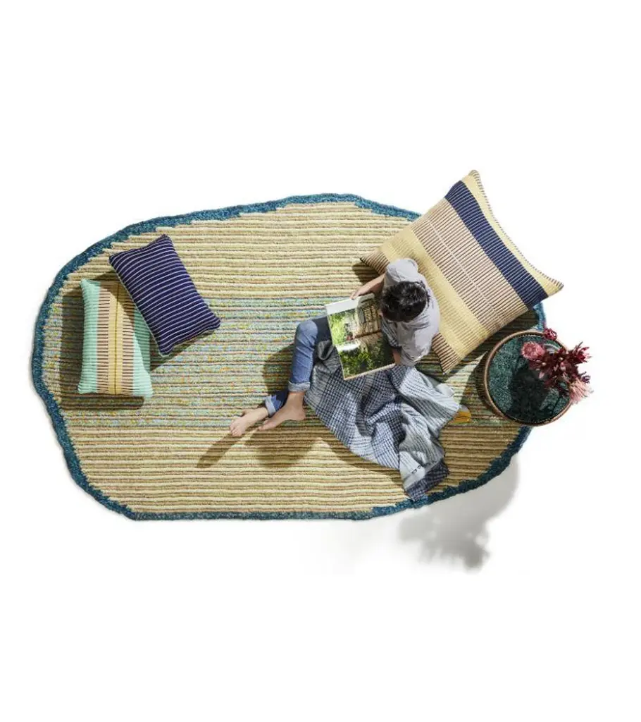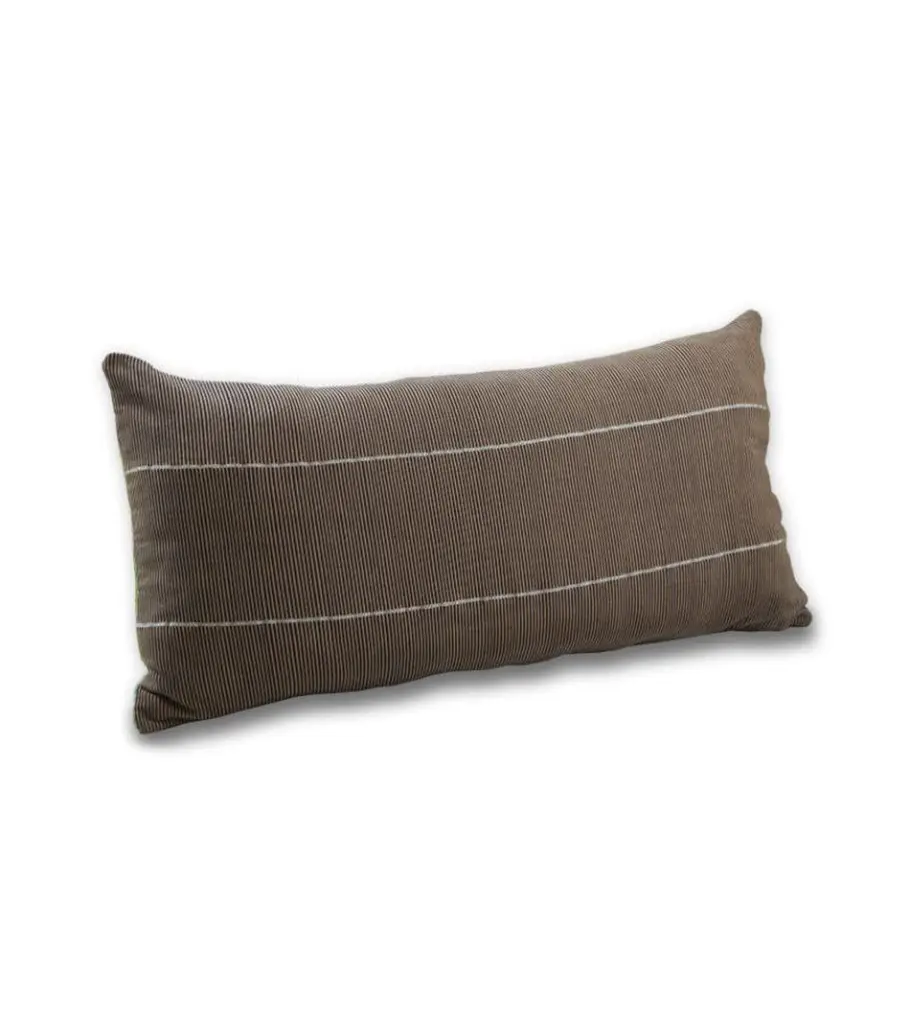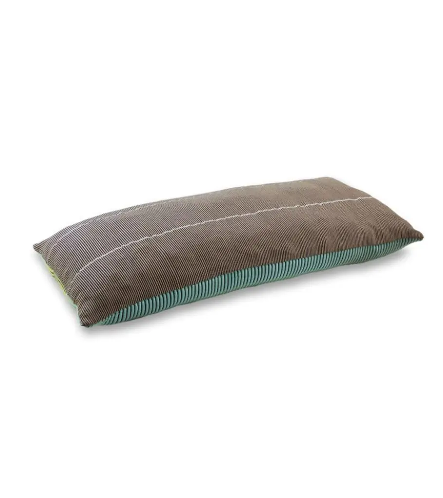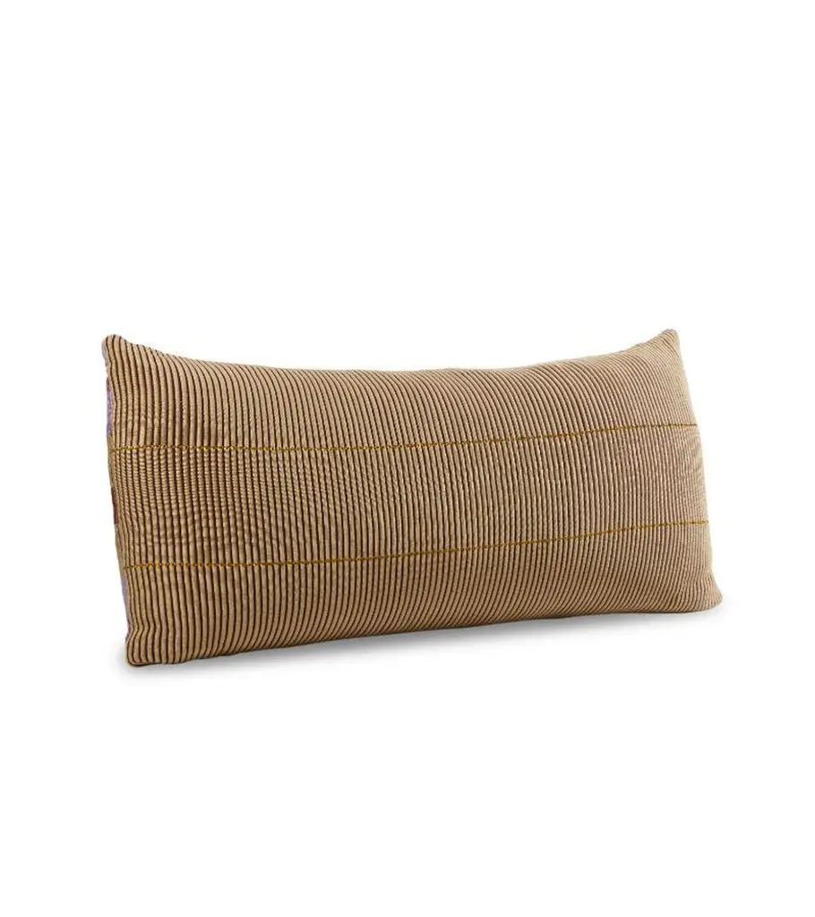 Chumbes Layer pillow by Mae Engelgeer. Materials: 100% Cotton. Technique: Hand-woven in Colombia. Dimensions: W 160 x H 80 cm Available in colors: Lila/ brick/ gold/ terra. Also available in sizes: Small, Large, and Cylinder Pillow.The Chumbes Cushion is a sumptuous accessory created by Dutch textile designer Mae Engelgeer. A lively addition to any sofa or lounge chair, its very intricate stripe pattern is inspired by the Chumbe Inga, a traditional Colombian garment. The cushion features two different hand-woven motifs that have a ribbed structure, making it a joy to touch. Thanks to the metallic threads that have been woven into the cotton, the cushion has a gentle lustrous shine. The Chumbes collection also includes a cylinder cushion and a large layer cushion. Each cushion is hand-woven in our partner workshops in San Jacinto, a municipality in the North of Columbia. Similar to the production of the hamacas, which are typical for the region, it is the artesanas, the craftswomen, who produce the textiles on vertical looms. It takes up to ten days for the women artisans to produce one cushion.Dutch designer Mae Engelgeer felt always drawn to textiles – from her school days through her studies at the Amsterdam Fashion Institute to her Masters in applied art at the Sandberg Instituut. Since opening her studio in 2013, she has been driven by her interest in traditional Craft techniques. Using yarns, colors, patterns, and fabrics, she pushes the boundaries of textile production to adapt old techniques for the modern day. Mae Engelgeer’s signature style combines subtle color palettes, patterns, and linear elements.